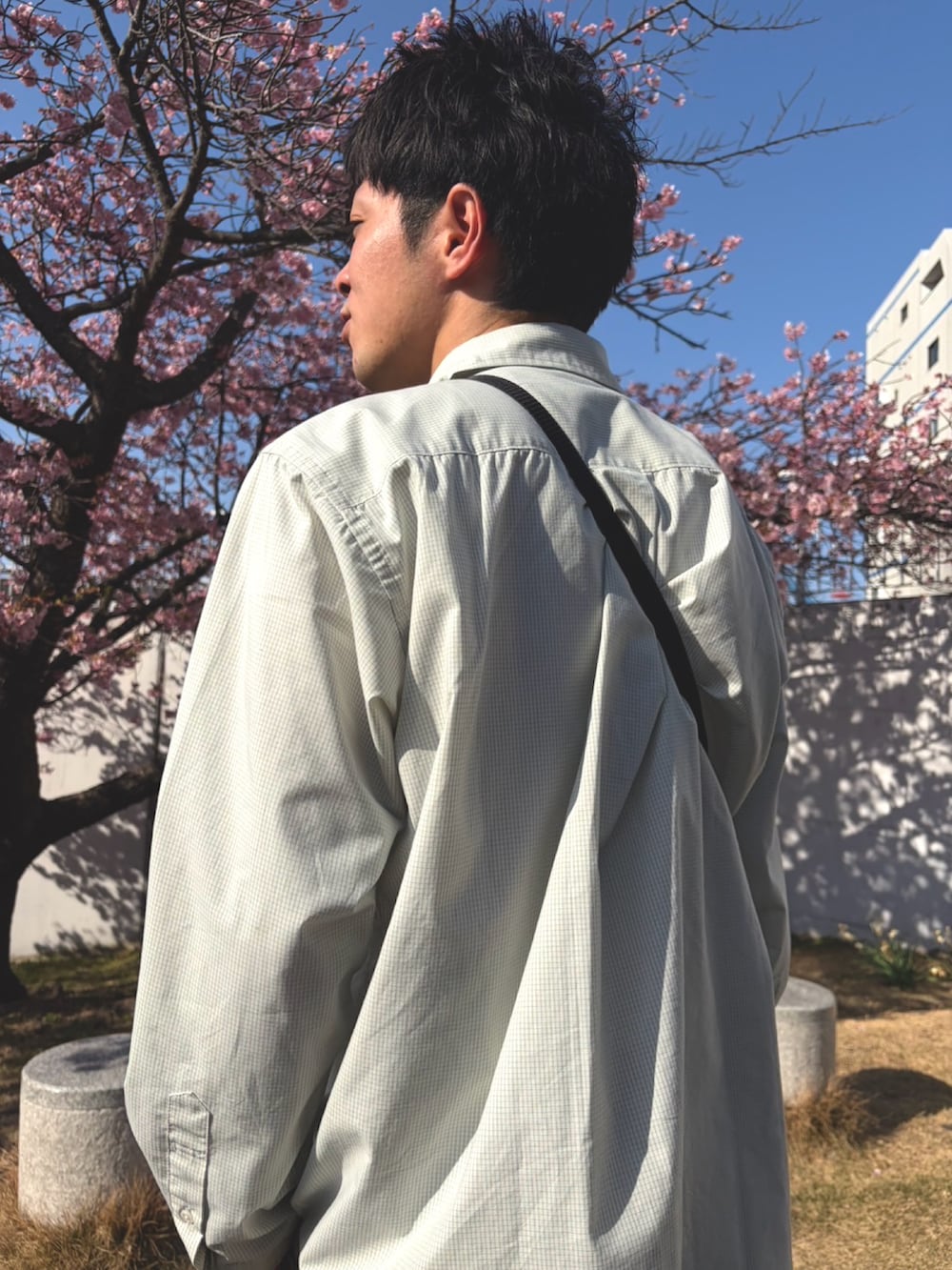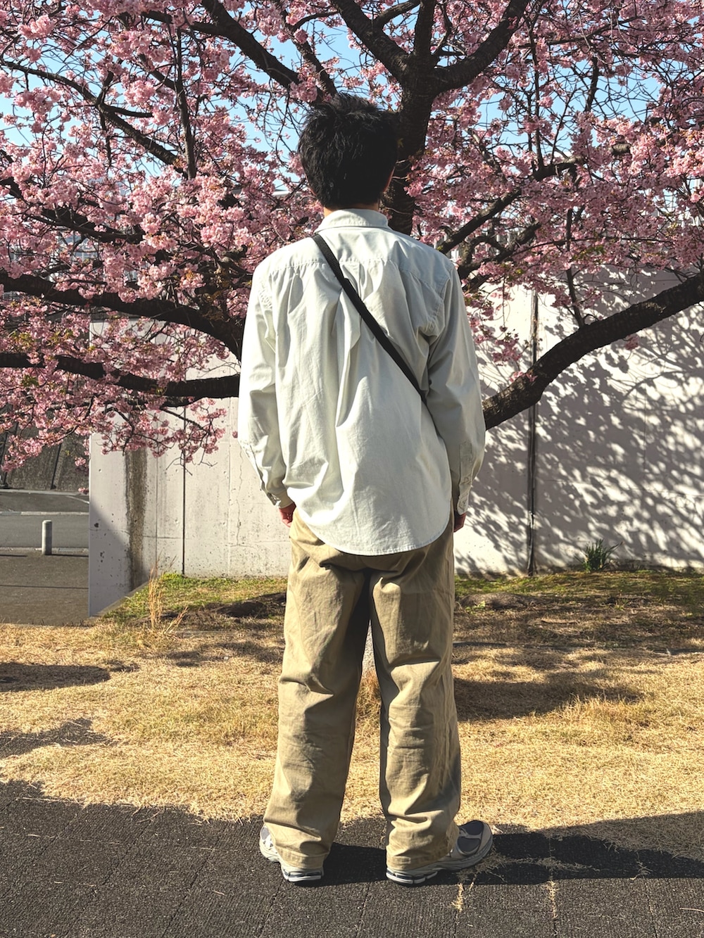 昨日は季節外れの春の陽気だったので、新作シャツ1枚で出かけてきました。地元の街の中に咲いていた河津桜をバックに春コーデ📷