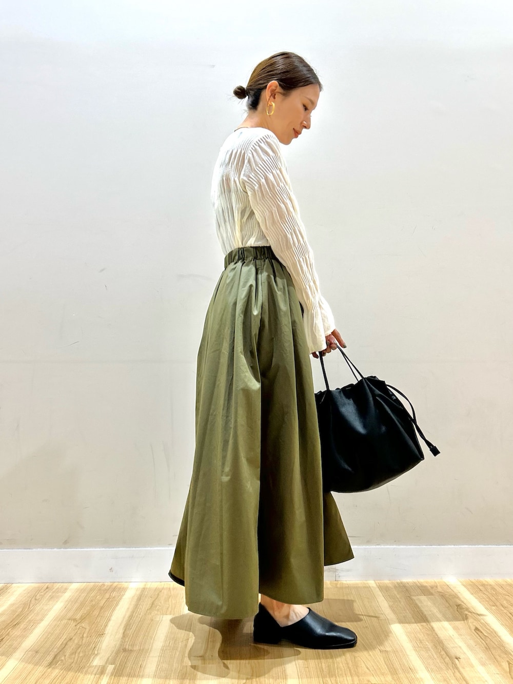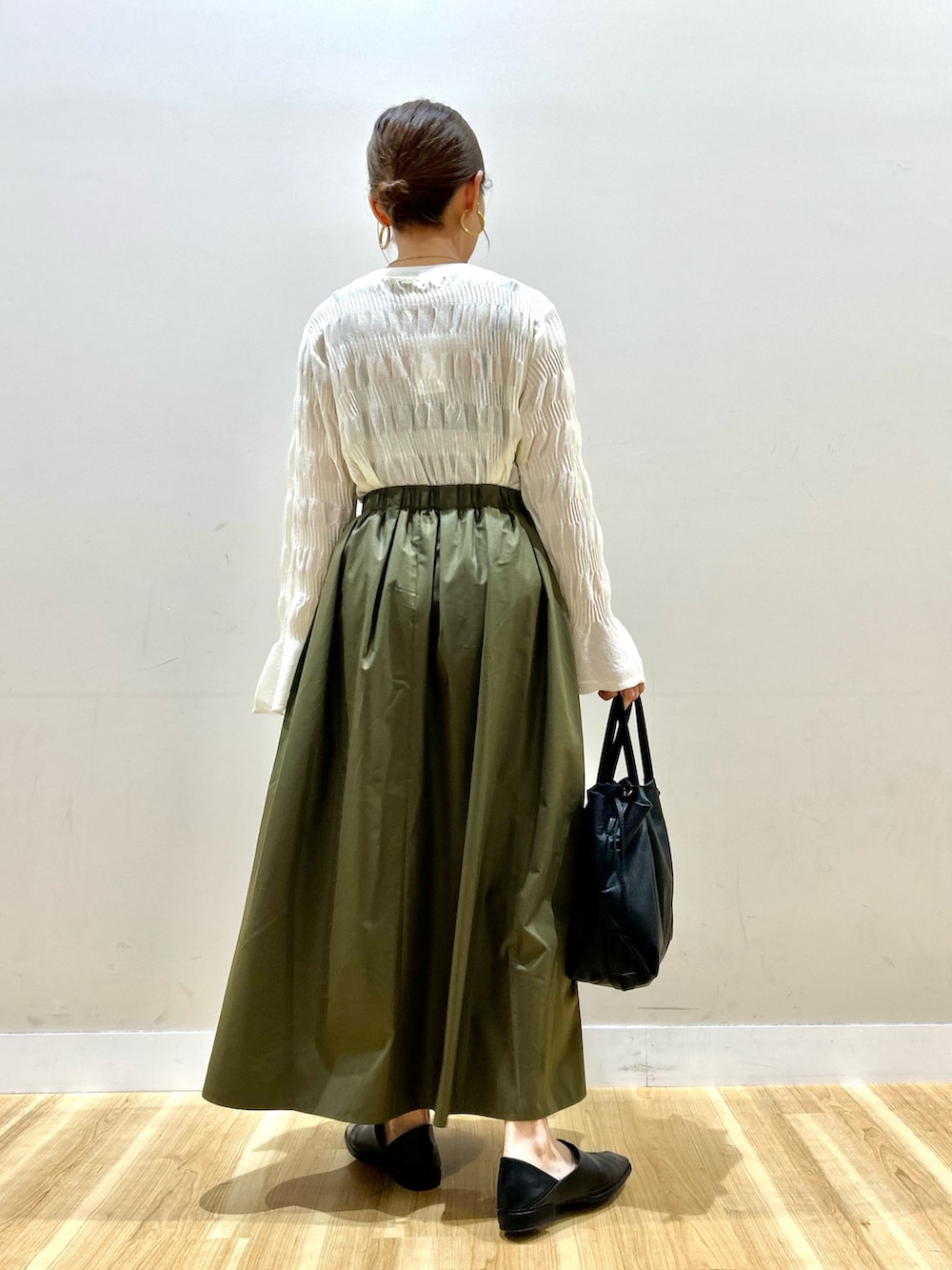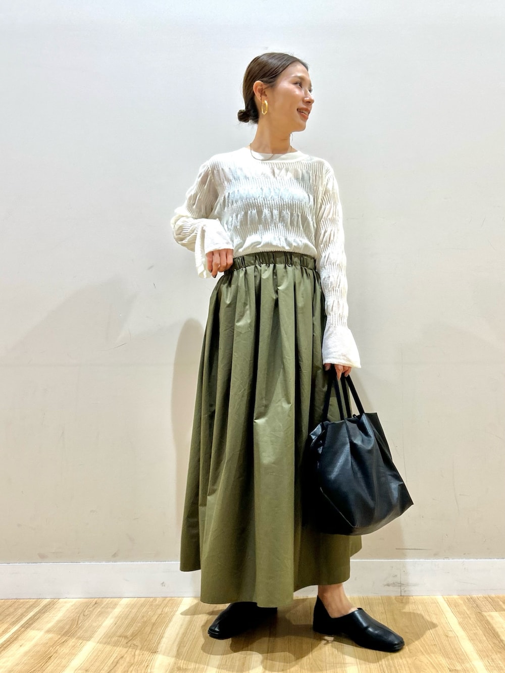 軽いシアー感や袖口のフレアが女性らしい雰囲気です