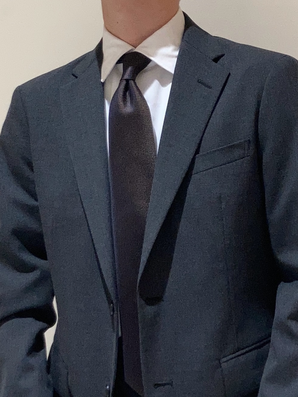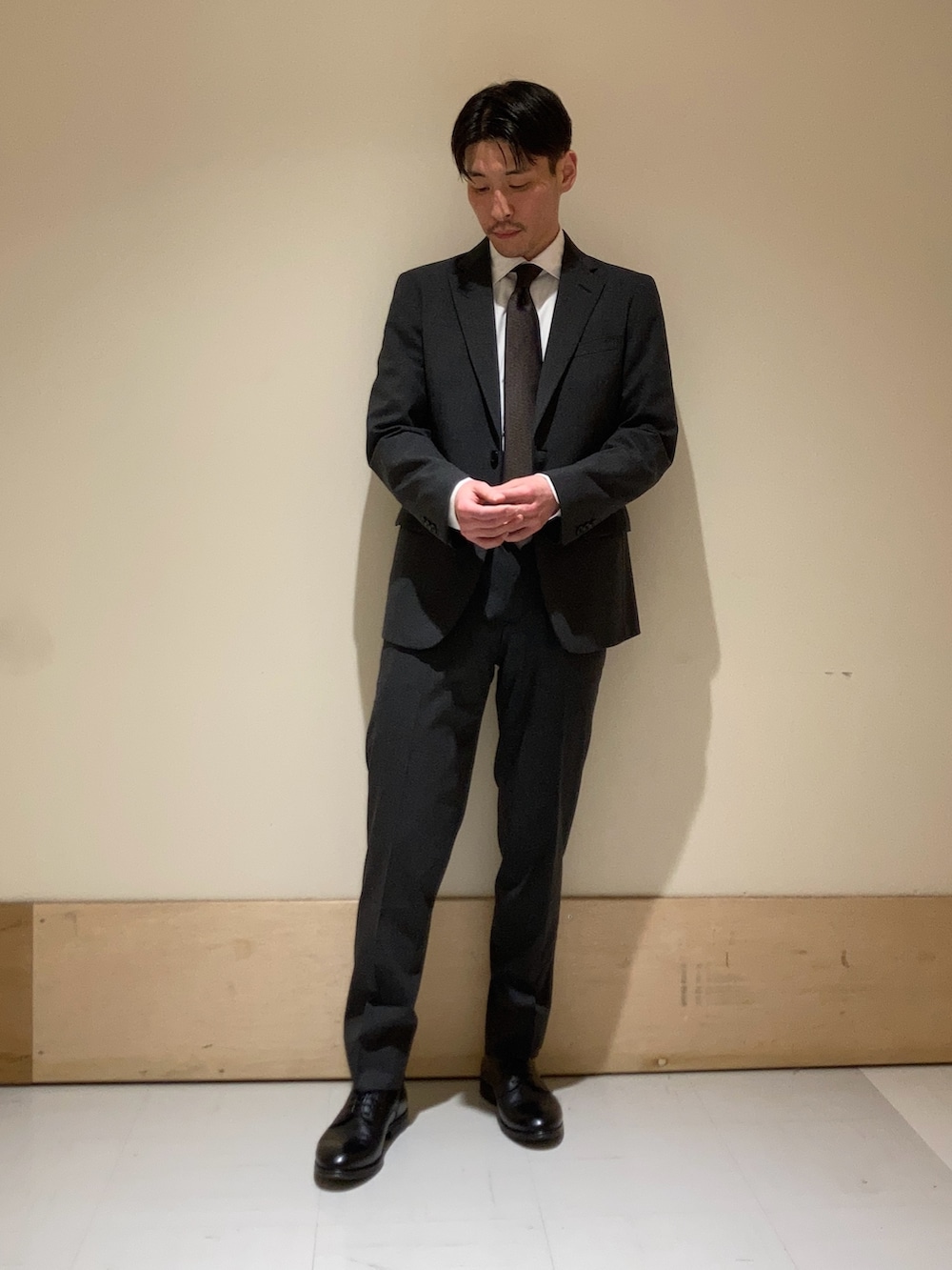今回はグレースーツにブラウン調のジャガードタイでビジネススタイル。