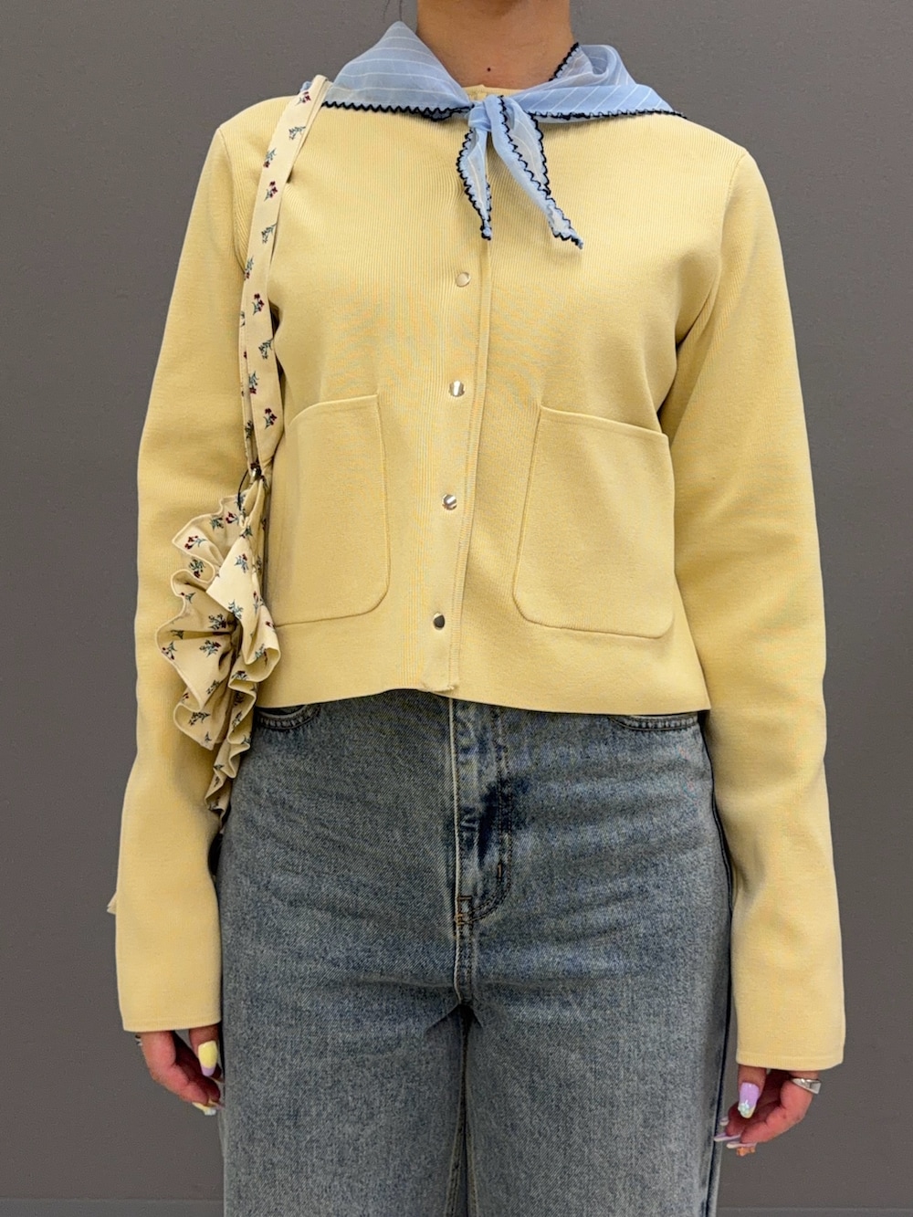 肩に巻いているスカーフはバッグにつけたり