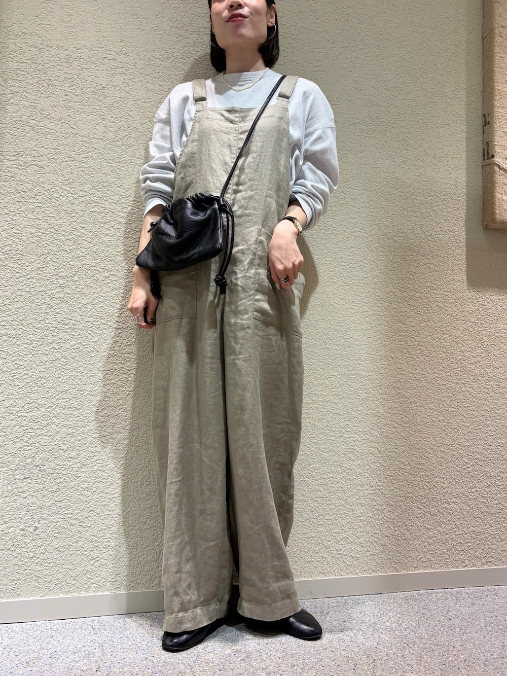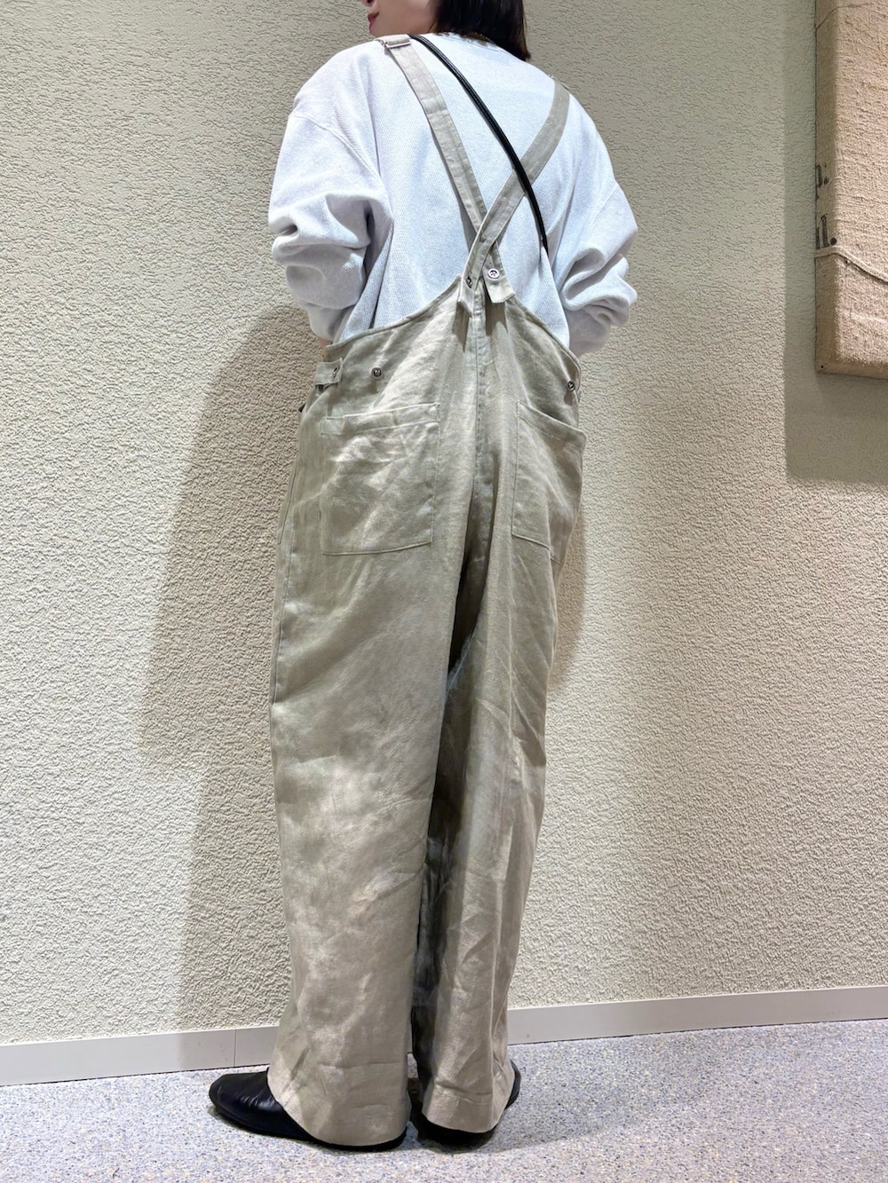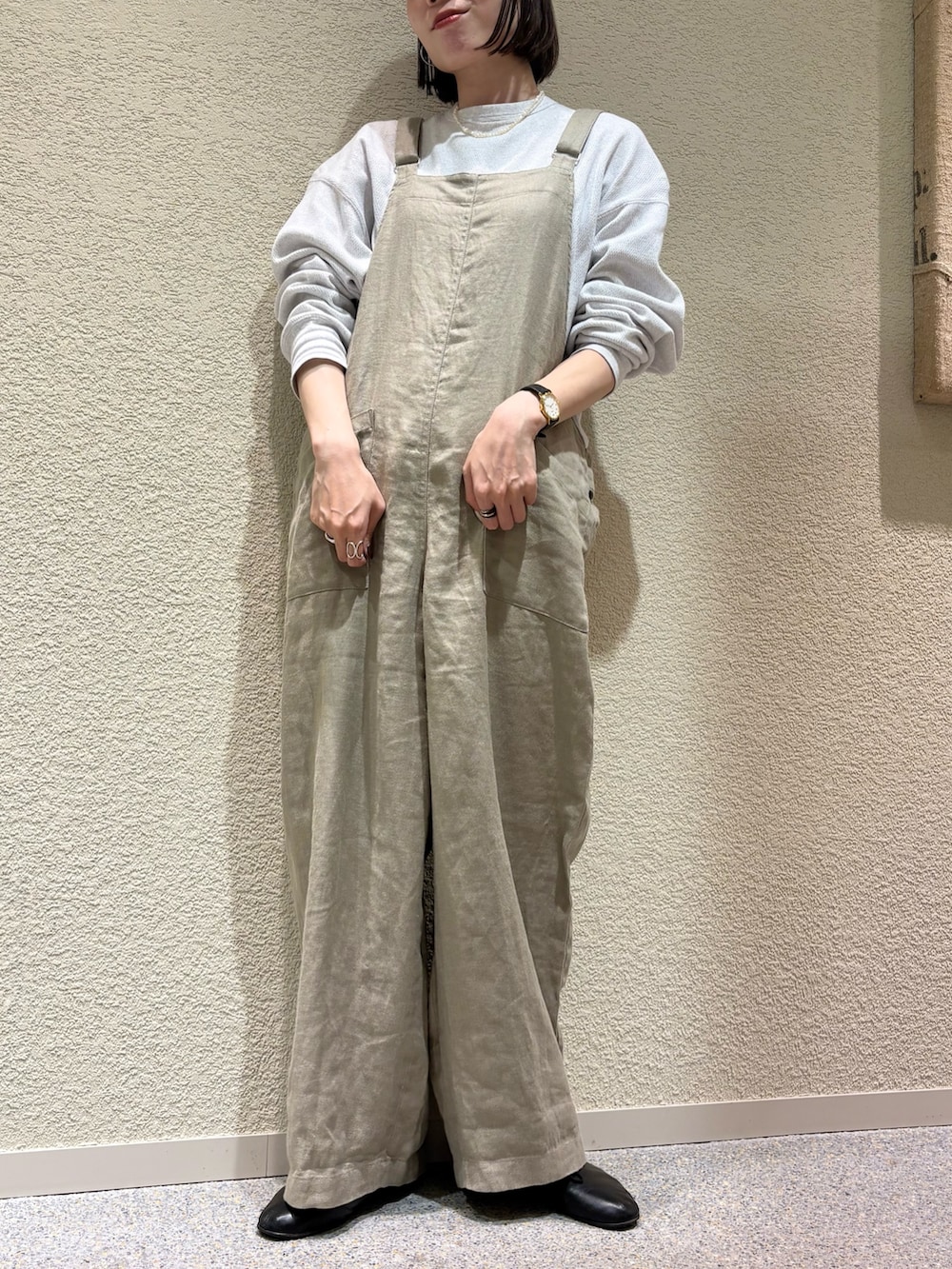 少し厚みのあるツイル生地のリネンを使用しており、ナチュラルな風合いのくたっとした雰囲気がありつつも、体型を拾いにくい生地感になっています。