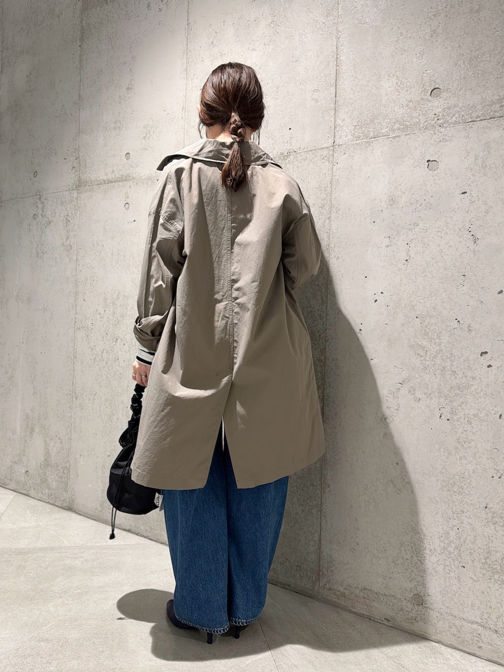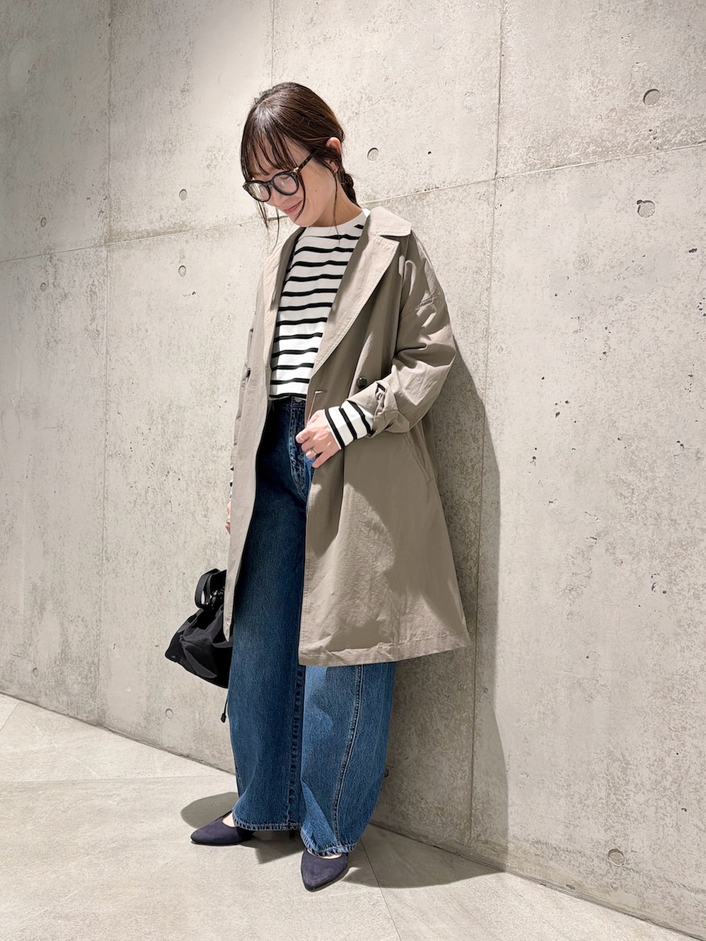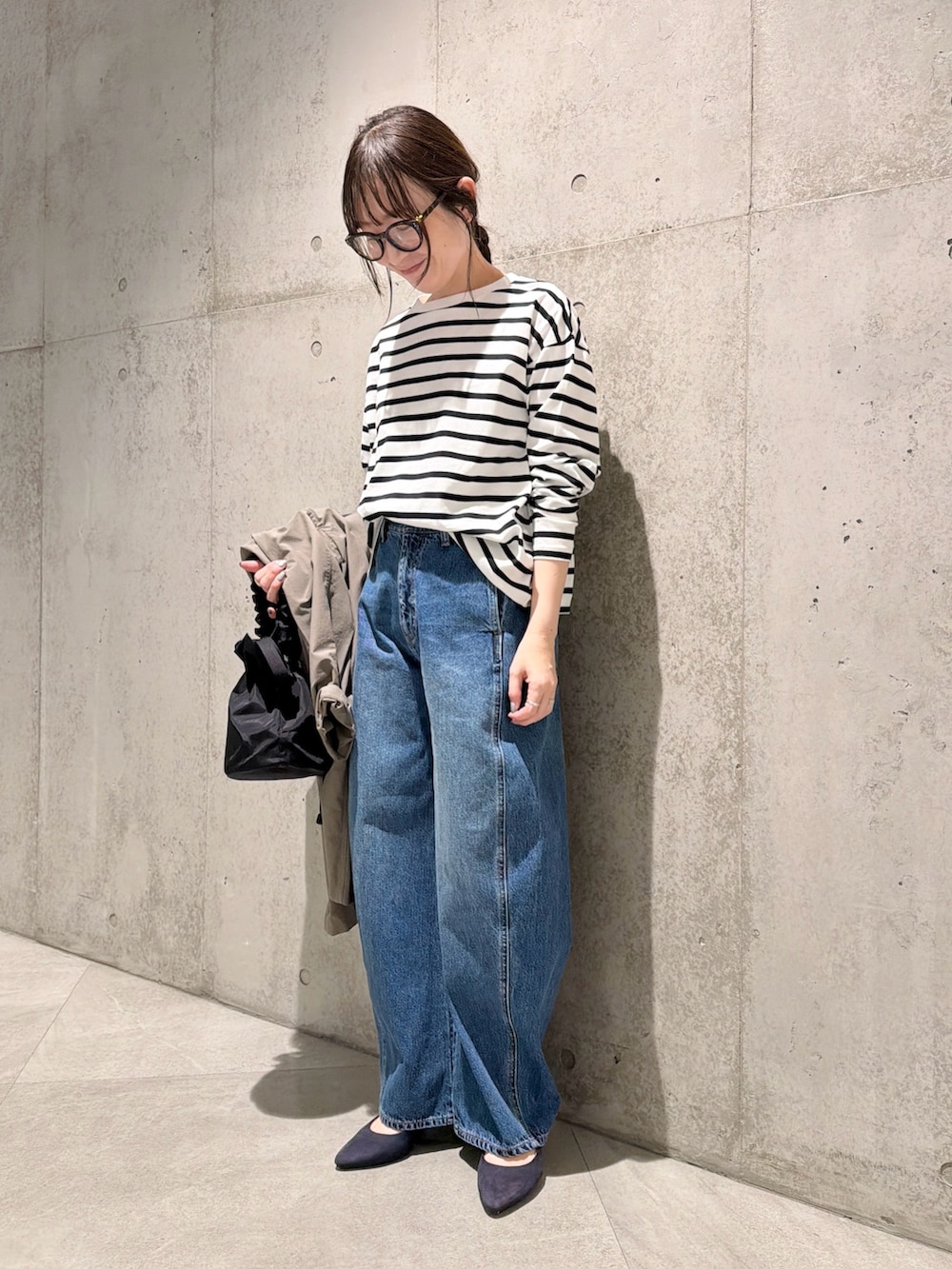 デニムパンツはゆったりとしたカーブシルエットがポイント。
