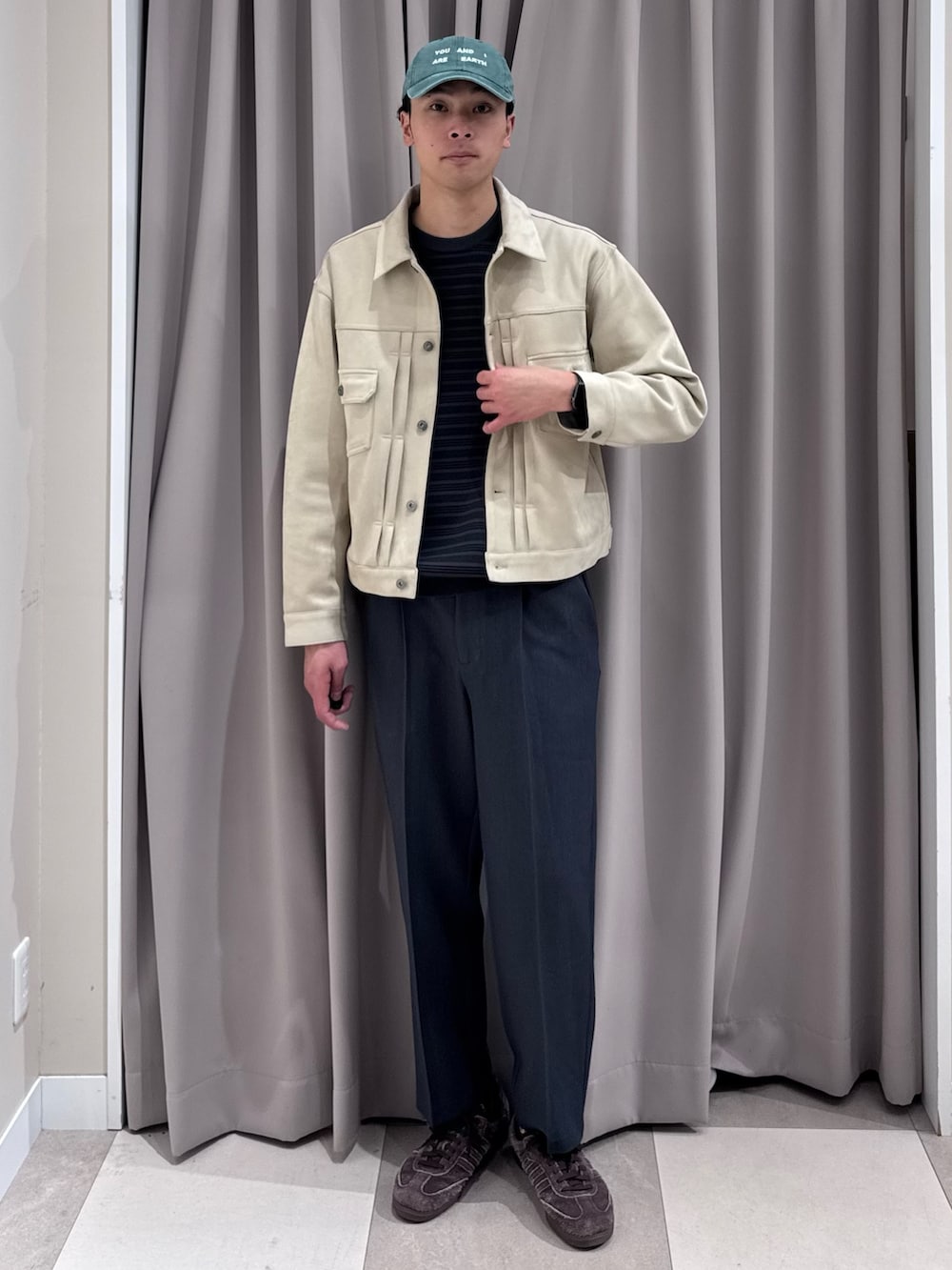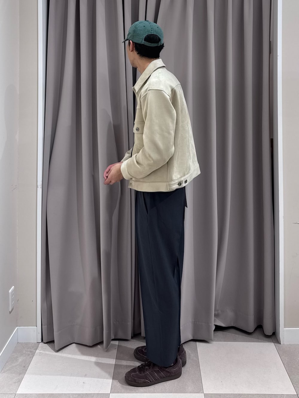 今らしい着丈のトラッカージャケット。スラックス合わせで綺麗めに。