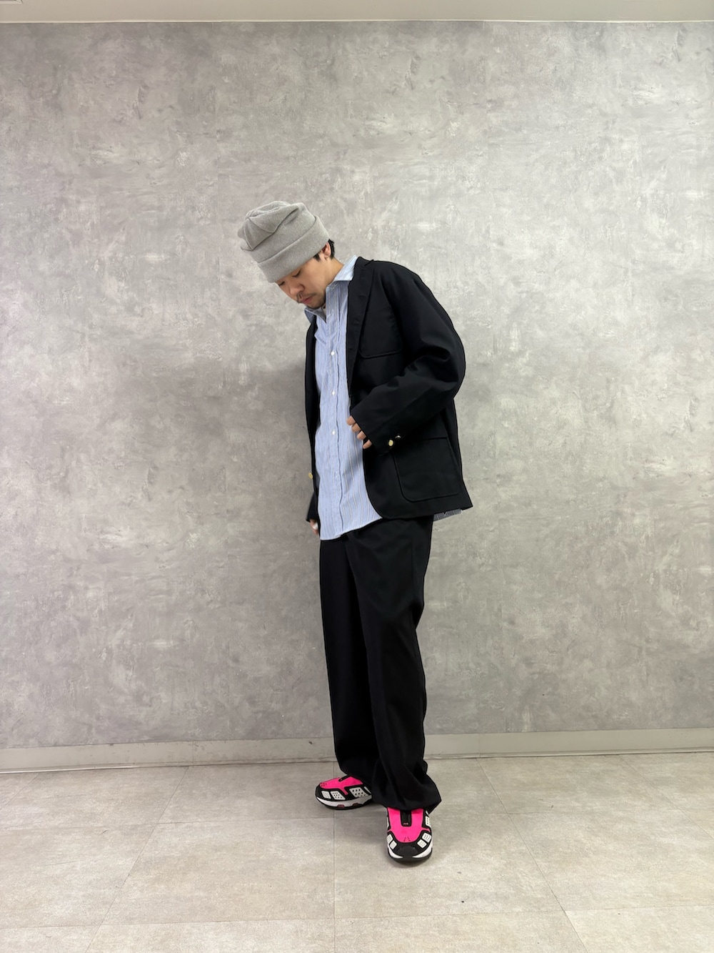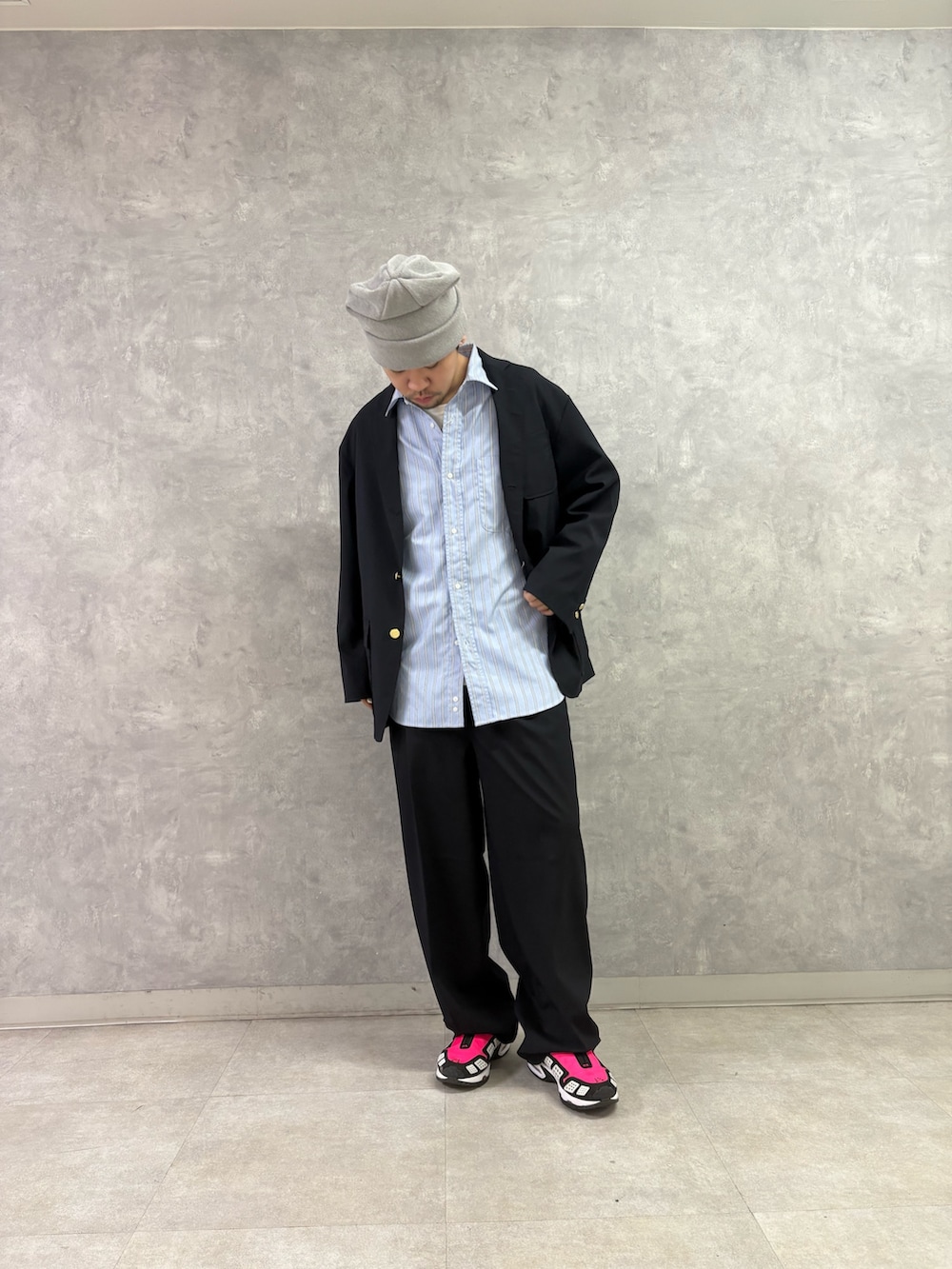 紺ブレのような形にも関わらず、肩がだいぶゆったりしてるのでインナー調節するだけで通年着こなせちゃう万能セットアップです。