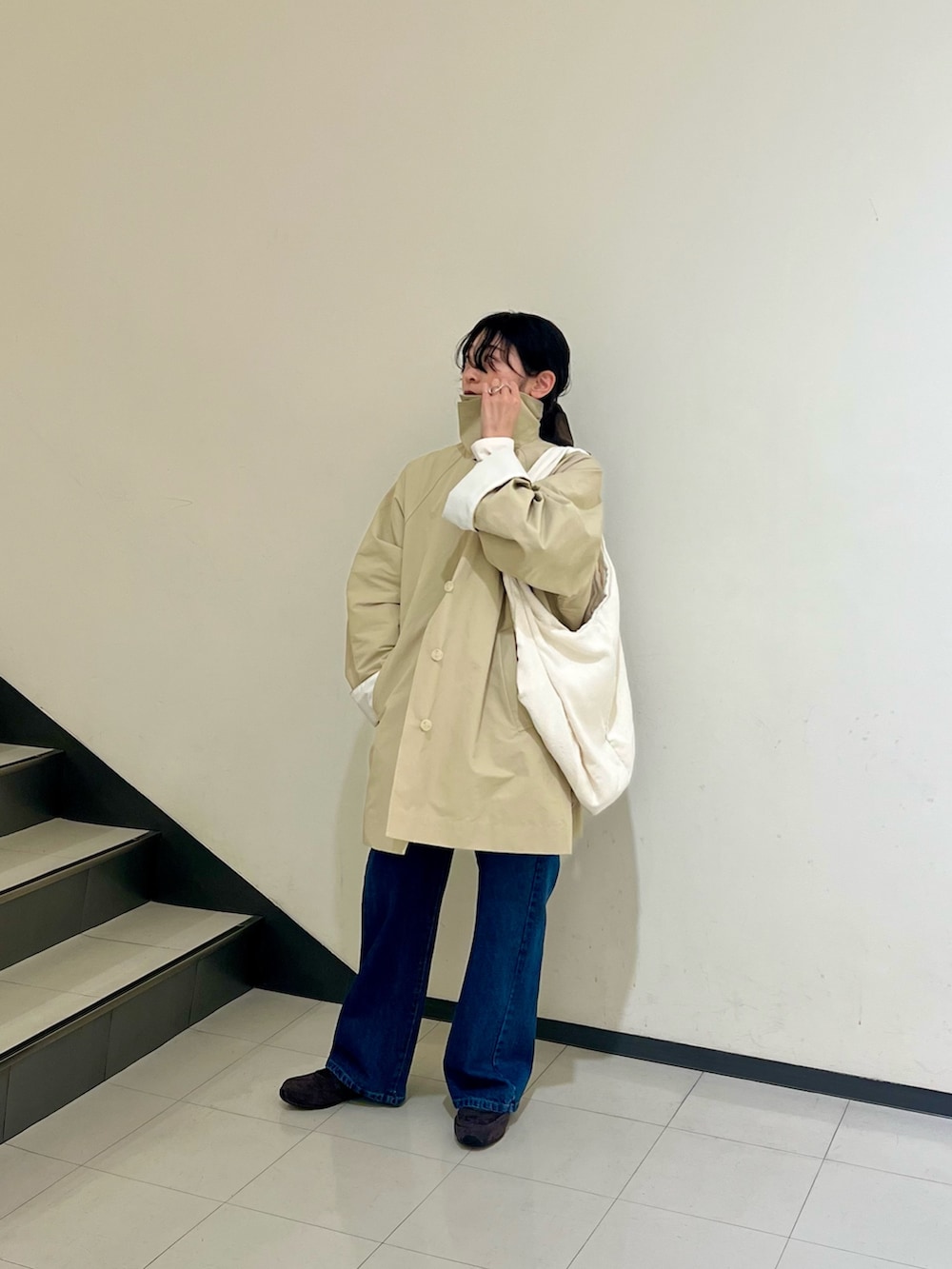 こちらのコートはスタンドネックにもなるのでまだ春風寒い時期でもマフラー代わりで活躍間違いなしです❕