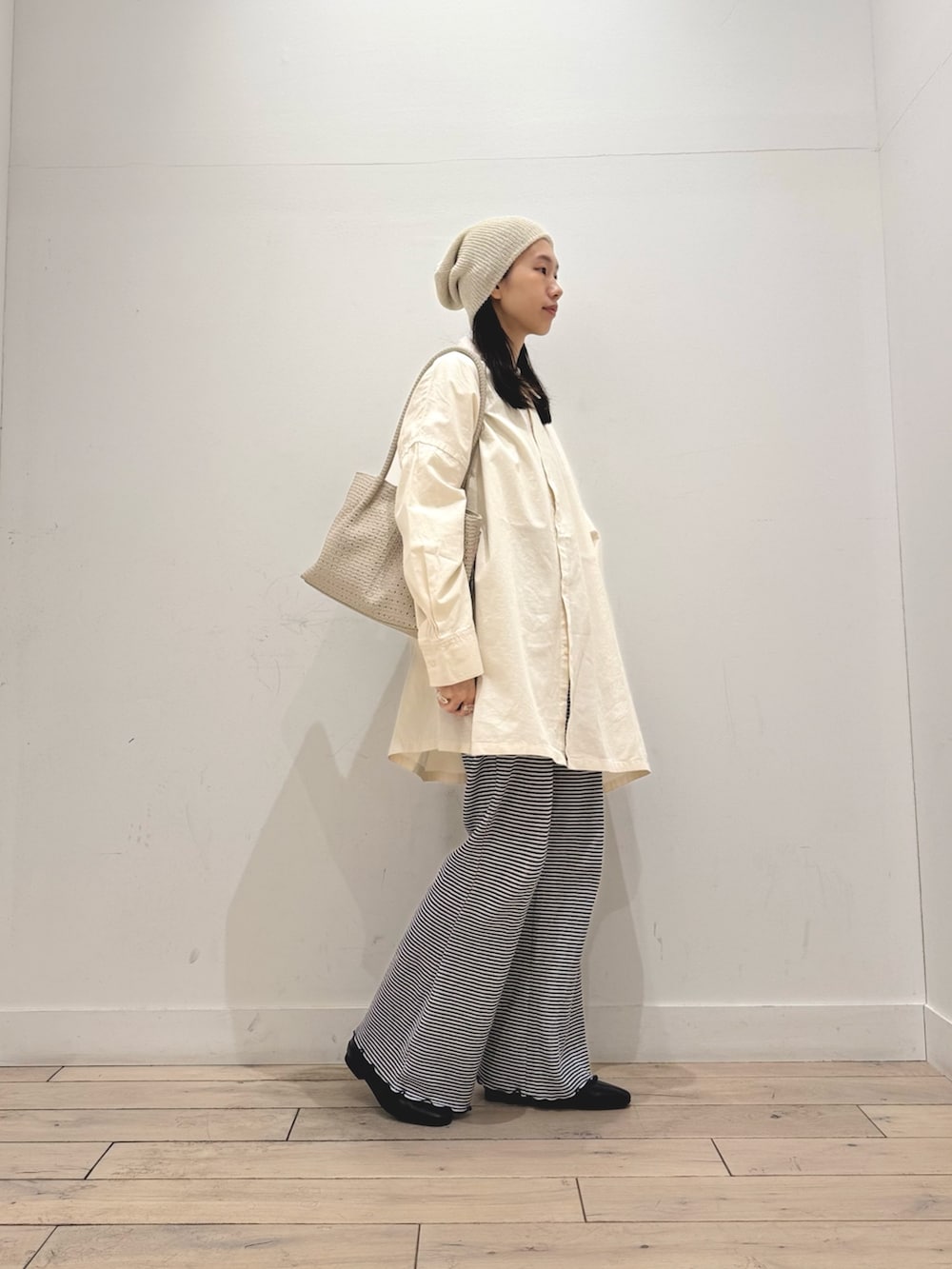 オーバーサイズシャツにリブパンツは間違い無いですね◎ボーダー柄がポイントになってくれます☺️伸びがよく、履いていて楽ちんです‼︎