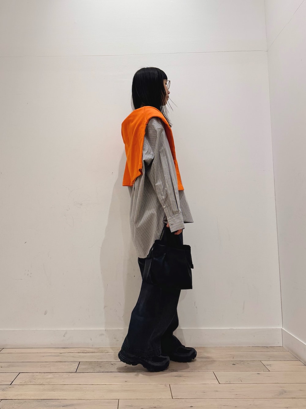 オレンジが差し色感ありますが、シャツも実はブルー系の色味で色物×色物の合わせになってます🍊