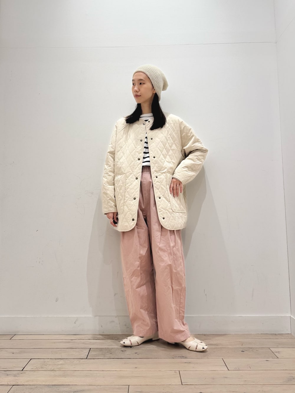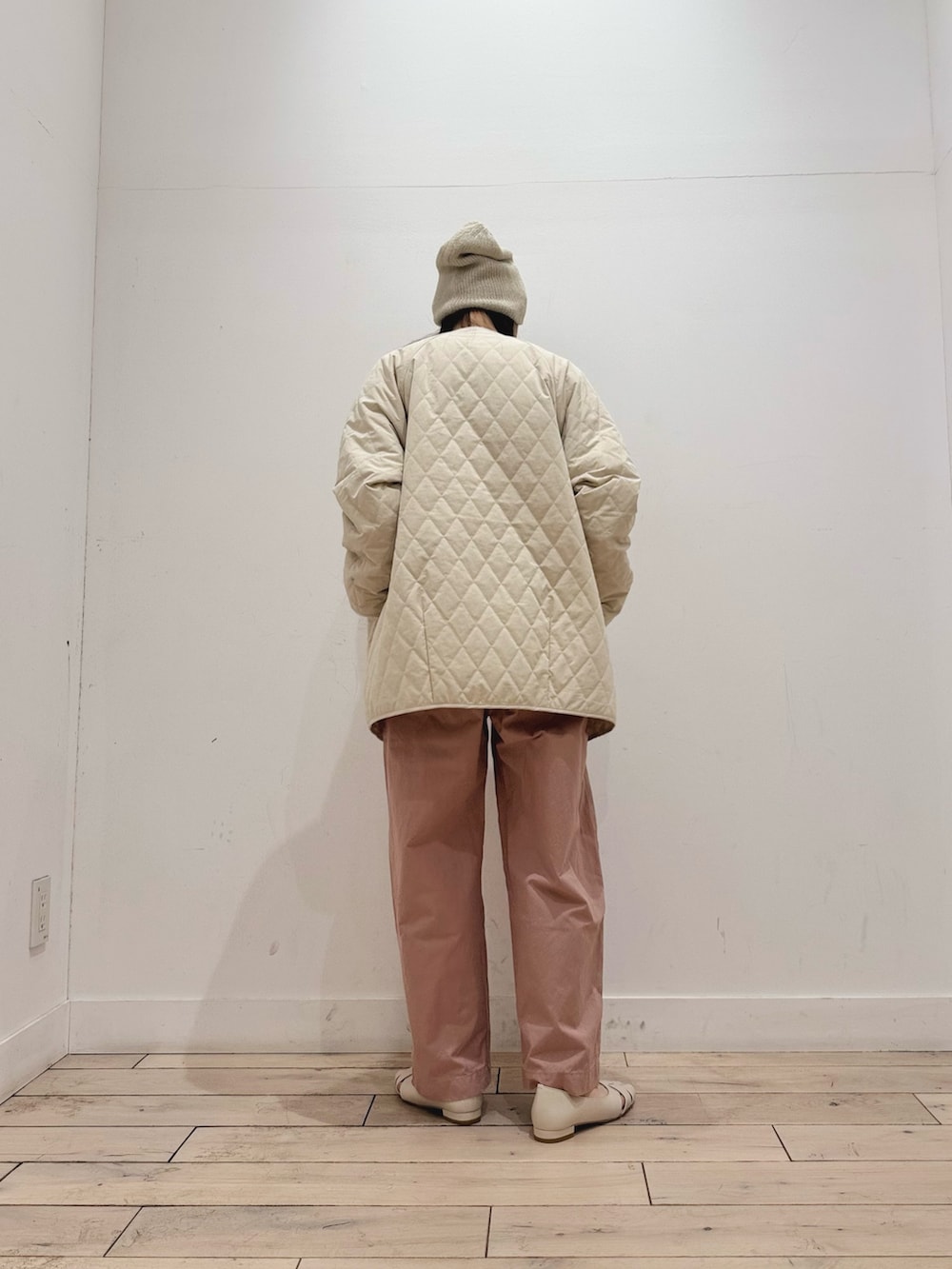 パンツのピンクの色味が絶妙です◎太めな印象もありますが、裾にかけてテーパードデザインになっているのでスッキリ見えします◎