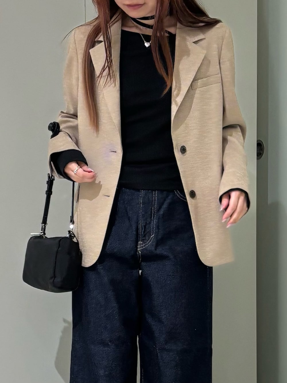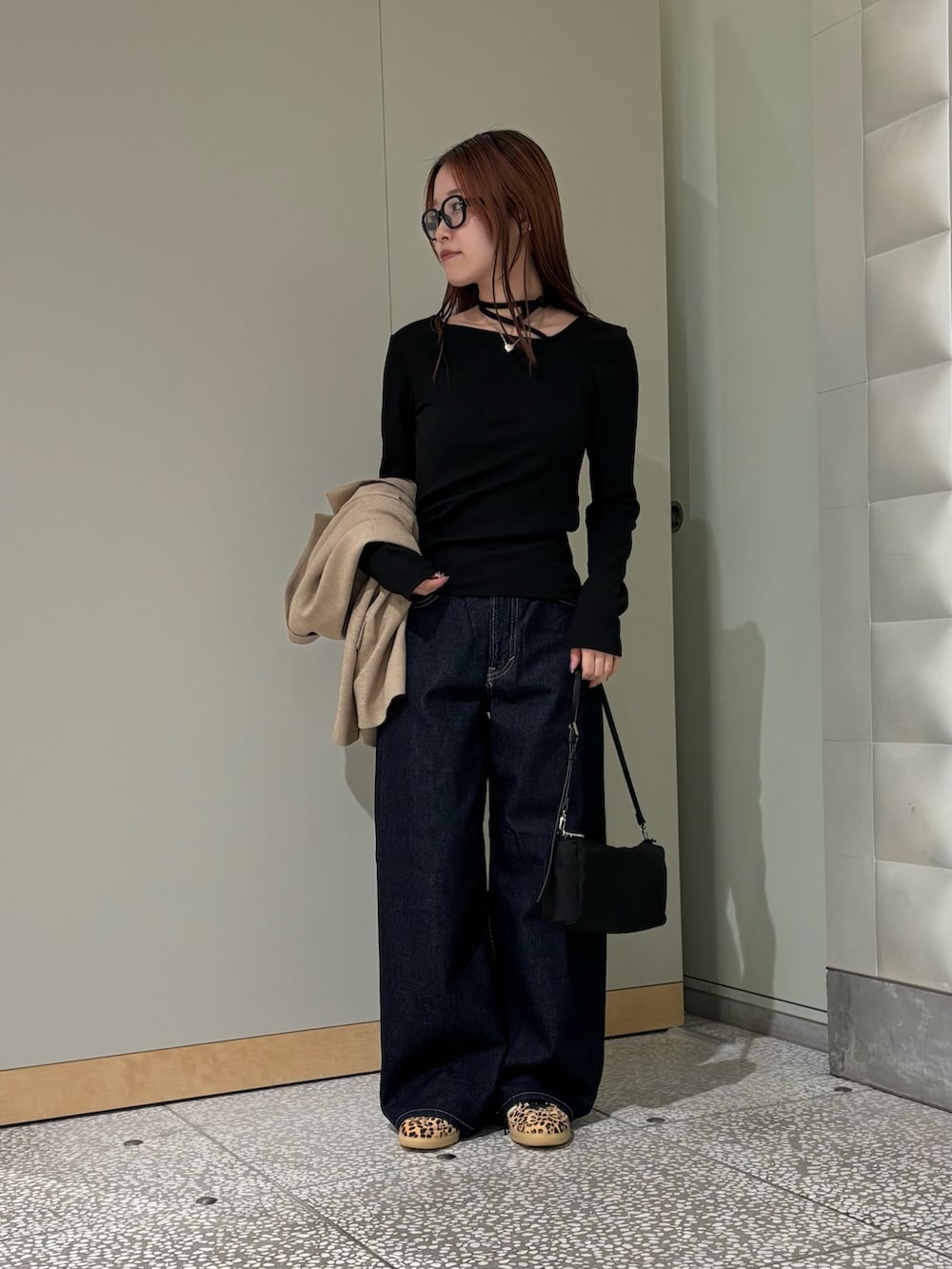 タイトなリブトップスで首元がスッキリとしてるのでヘルシーな着こなしです。首元の紐はお好みで結んでいただけます。