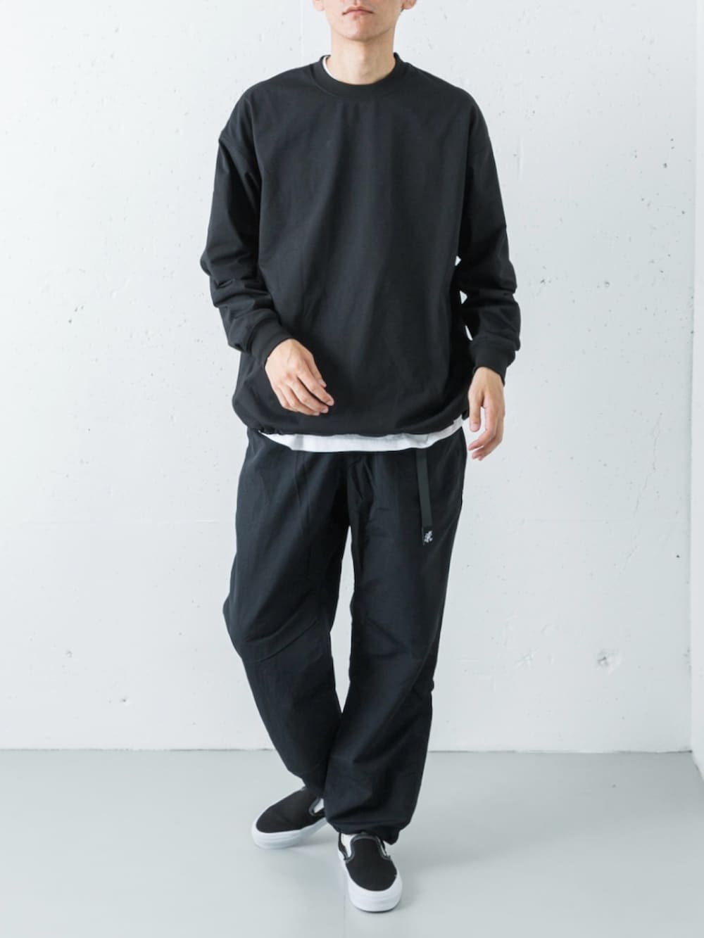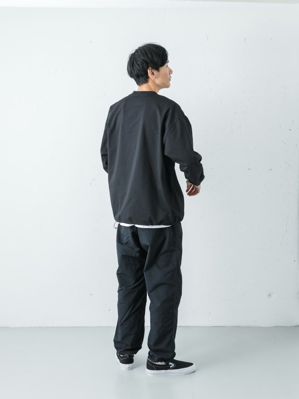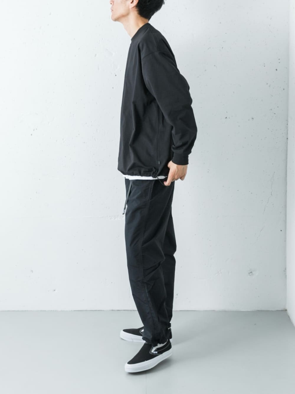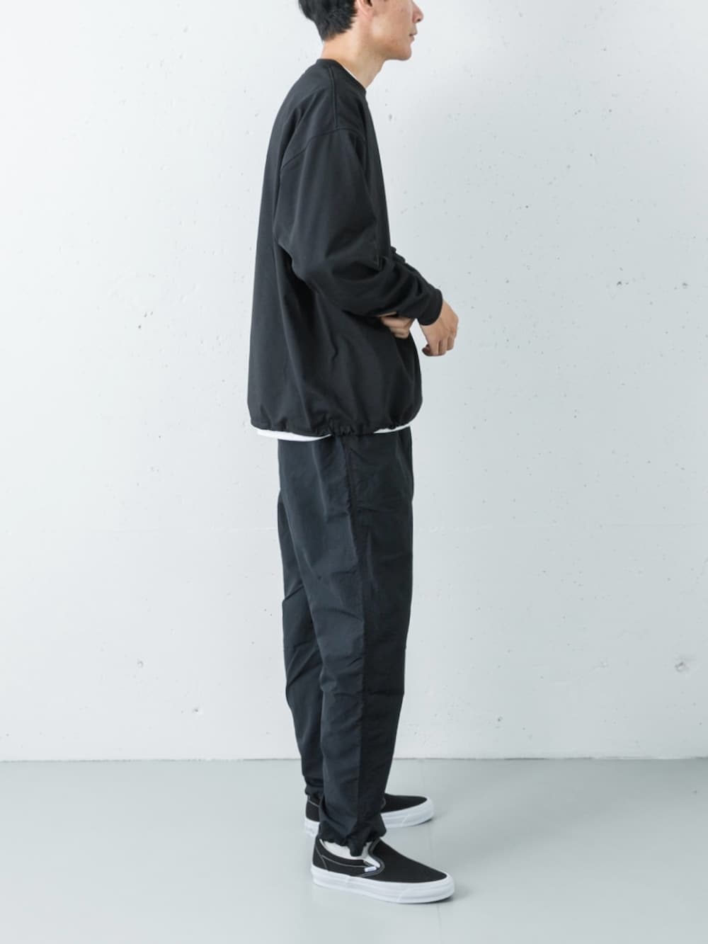 トップスのドローコードを絞ってふんわりとした立体的なシルエットを作りつつ、足元はハイテクスニーカーではなく、あえてアナログなVANSのスリッポンをセレクト。白黒のコントラストとスケートシューズのストリート感が、全身黒のストイックな装いを「本気のスポーツウェア」から都会的な日常着へと見事に落とし込んでいます。
