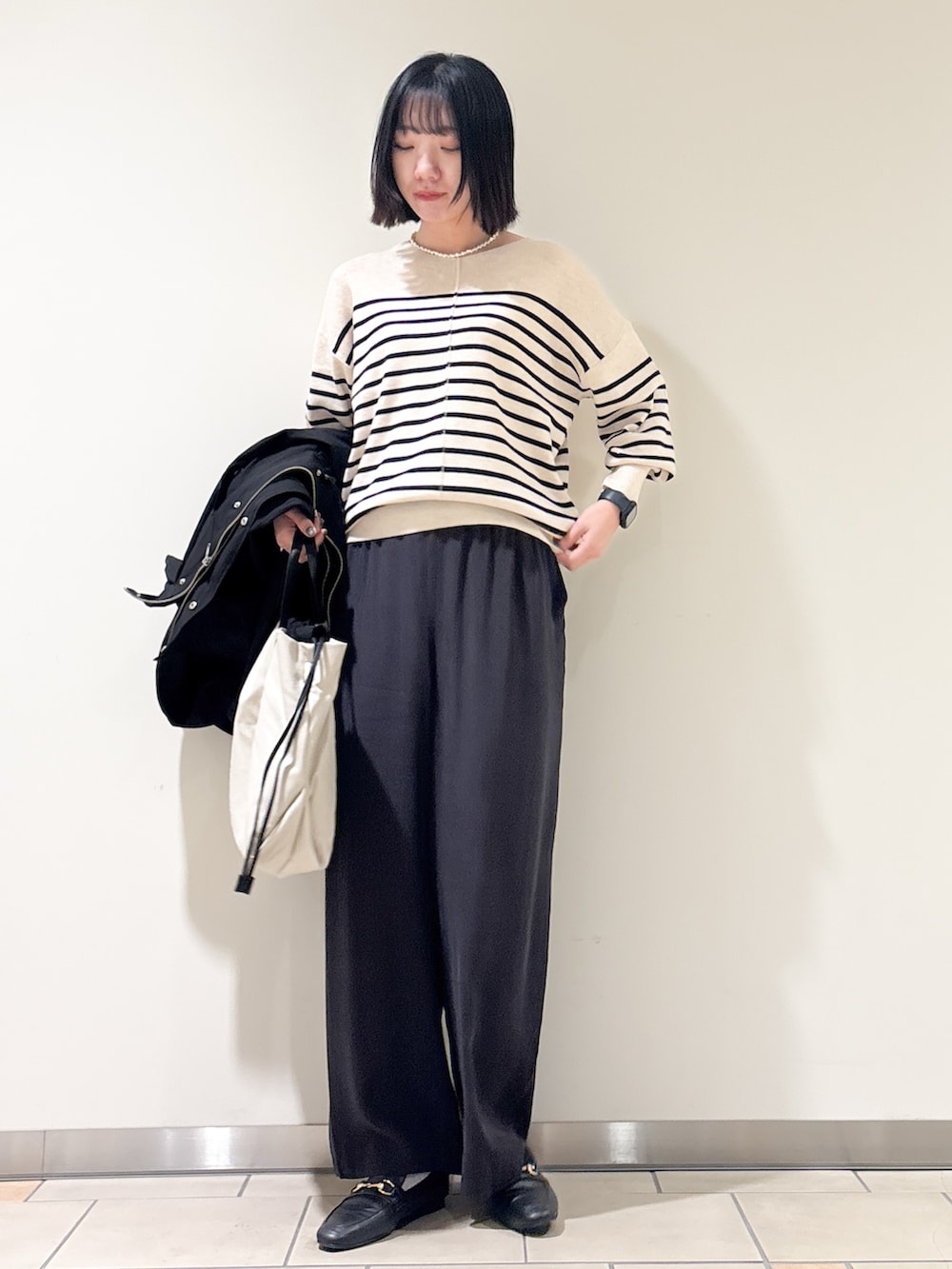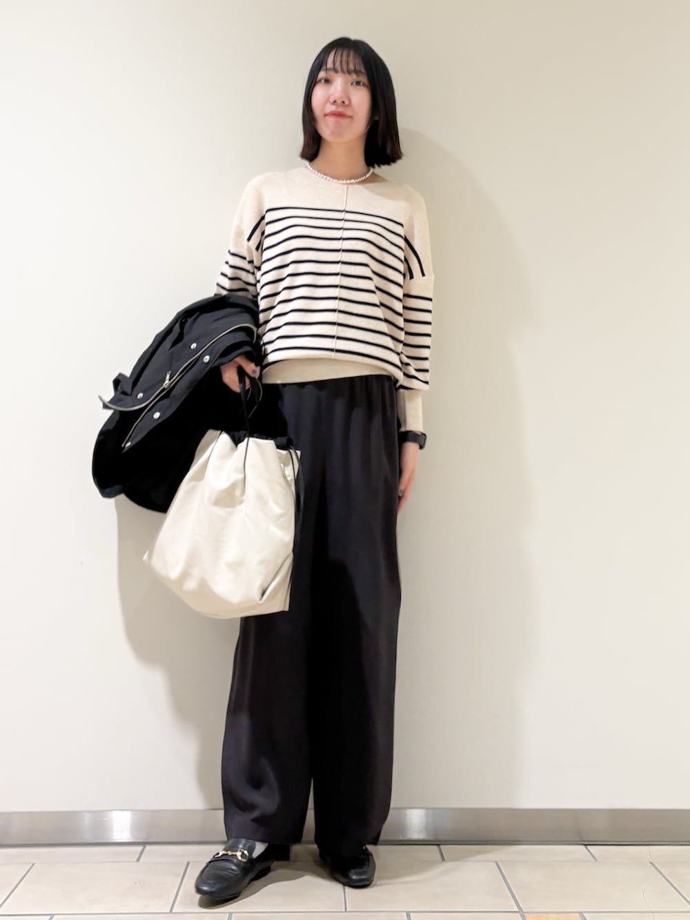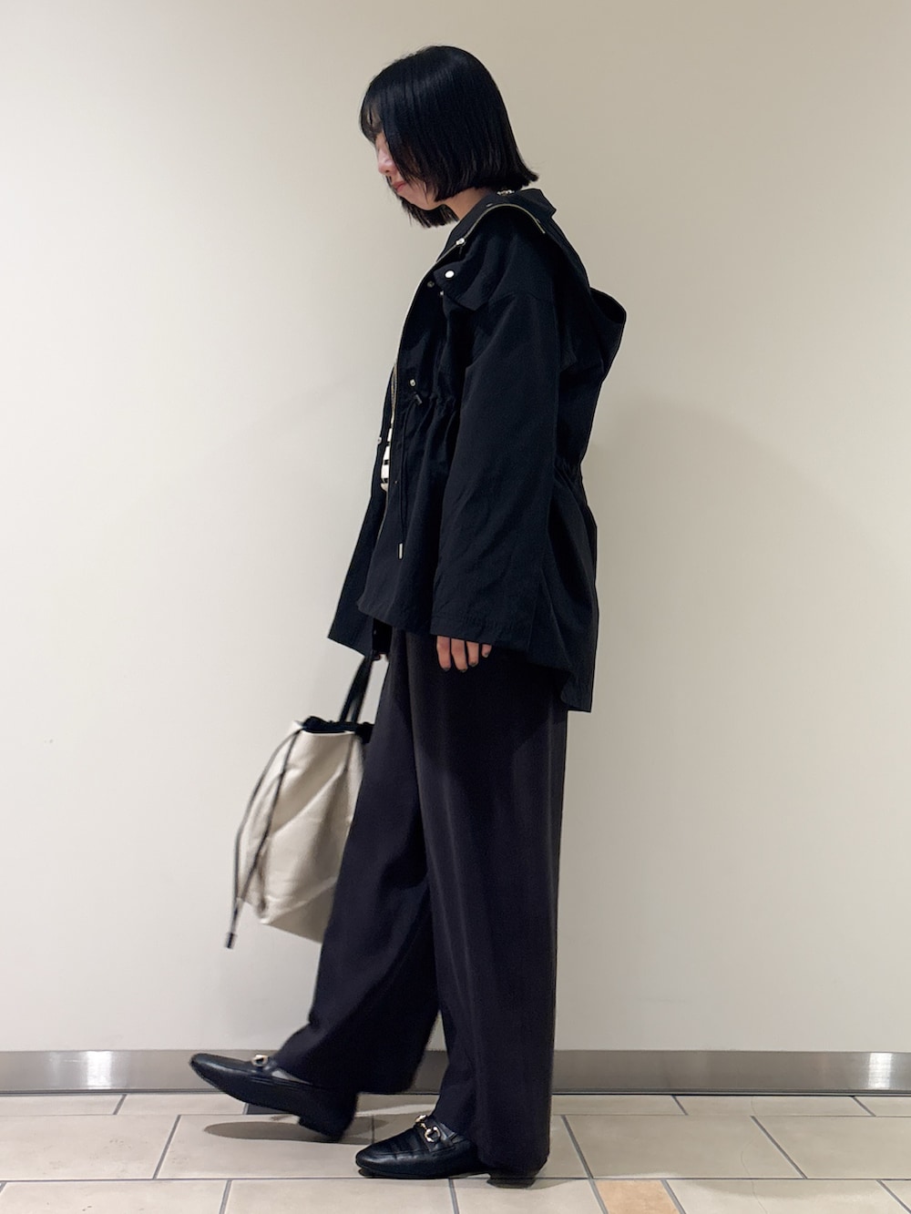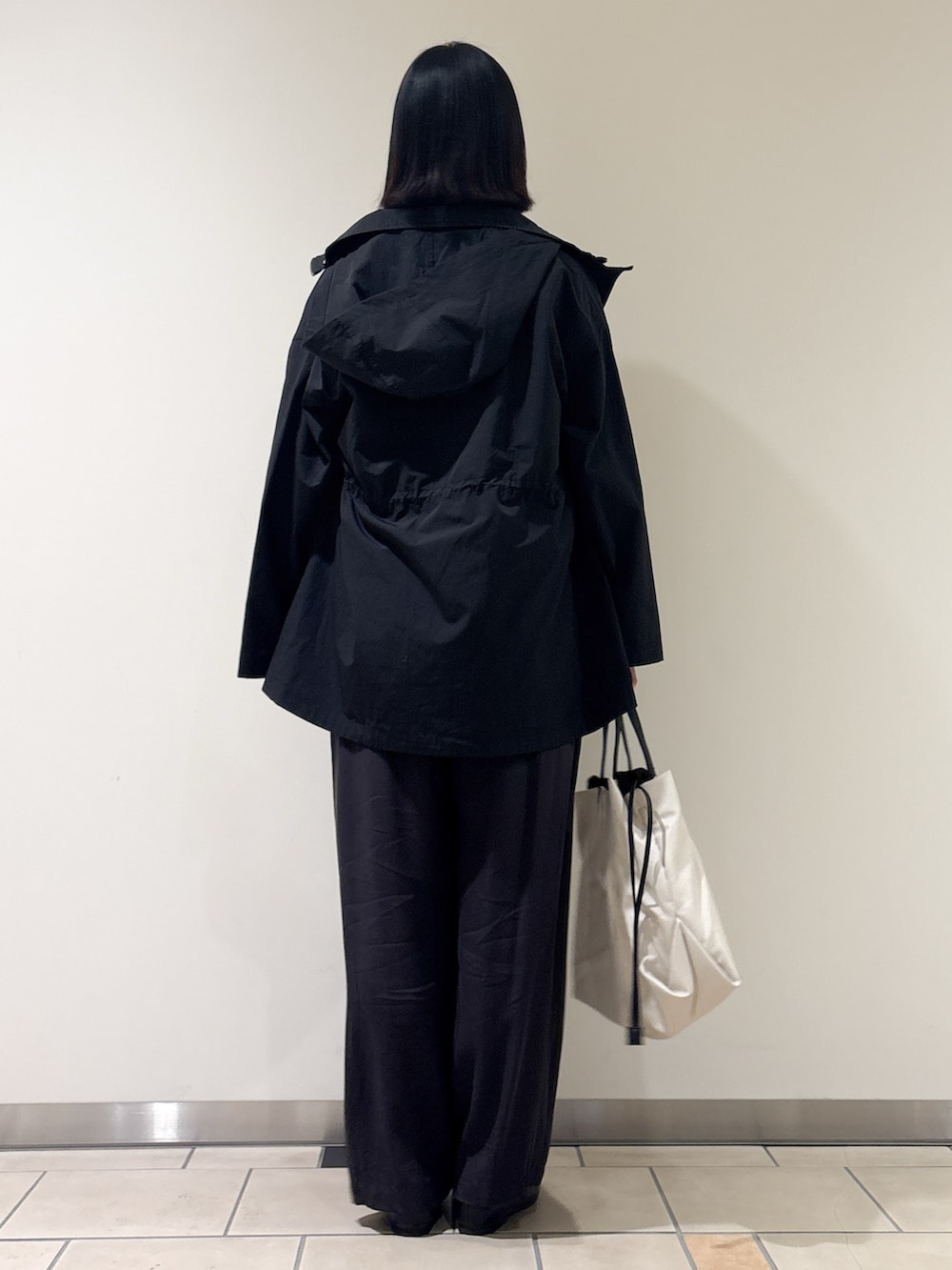 カジュアルな印象のマウンテンパーカーですが、ほどよい光沢とウエスト絞りのおかげで綺麗めにも着れました^^