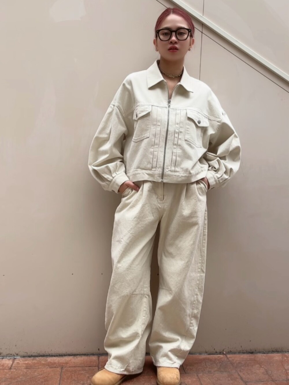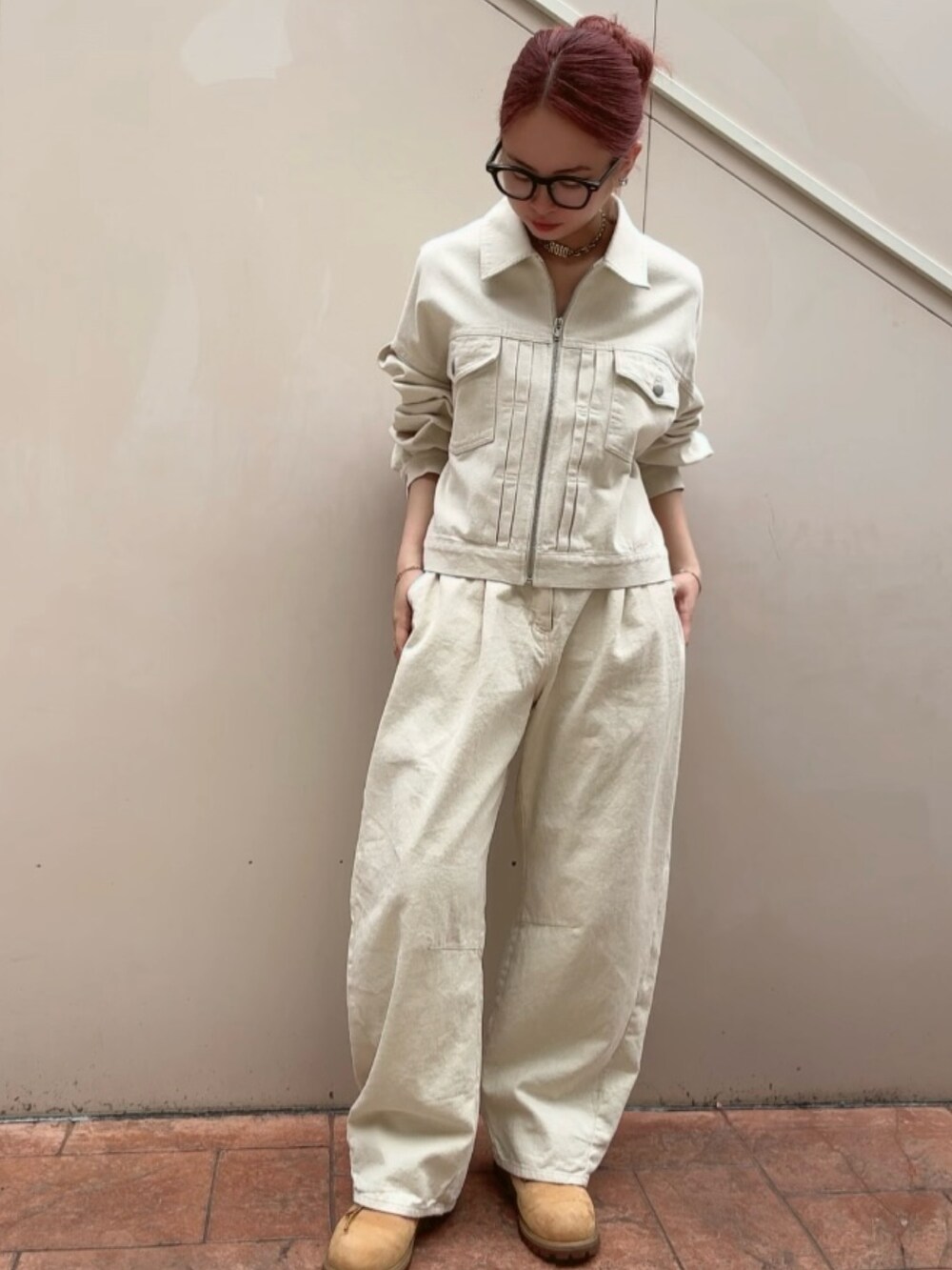 デニム素材のZIPブルゾンと同素材ボトムを合わせたセットアップスタイル。
