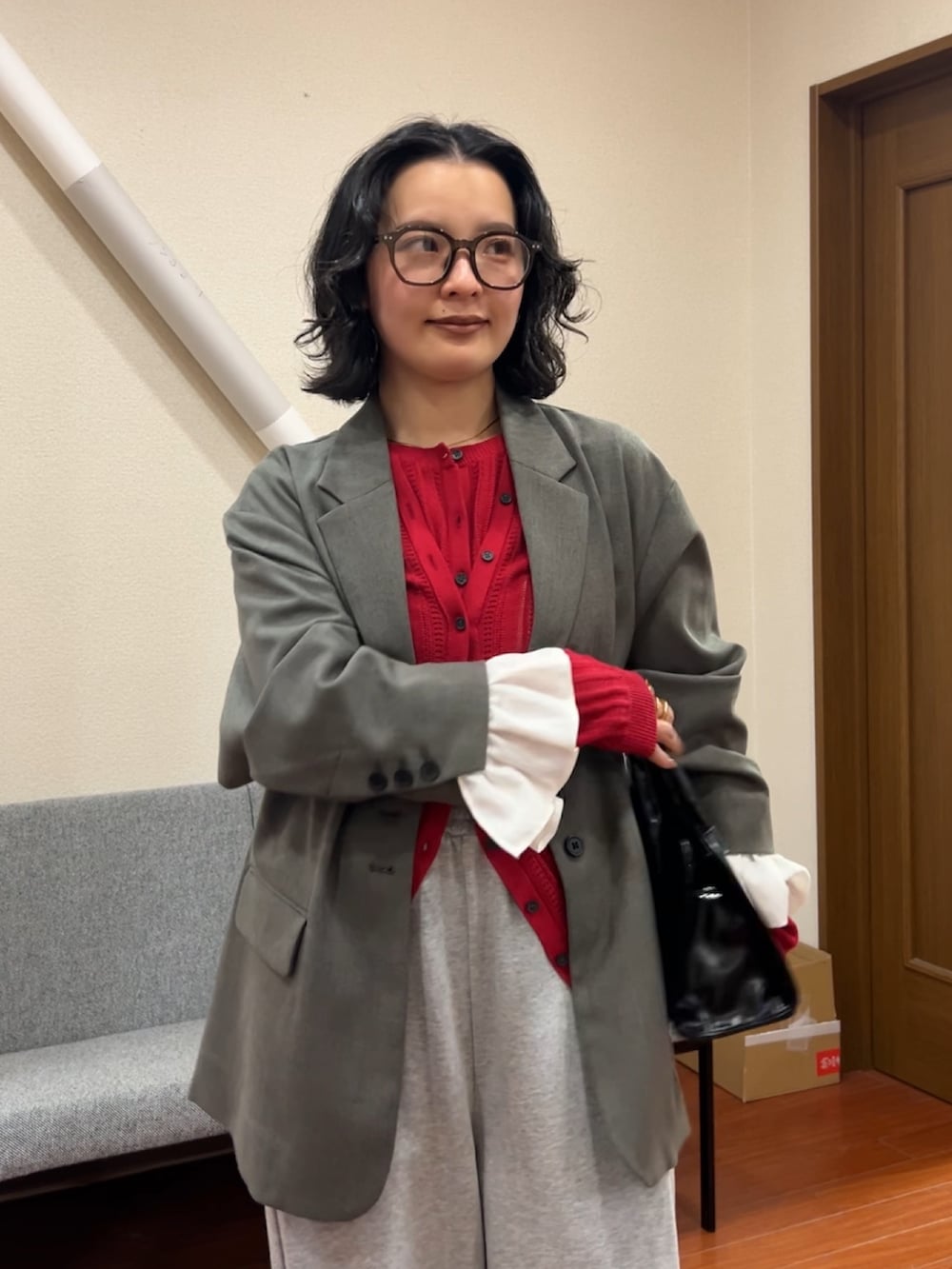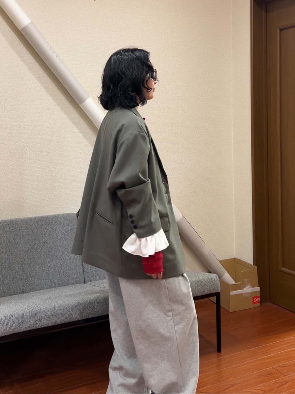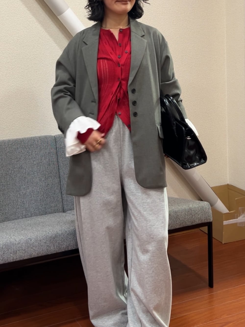 少し甘めなジャケットとスウェットパンツでバランスを取ったコーディネートです!