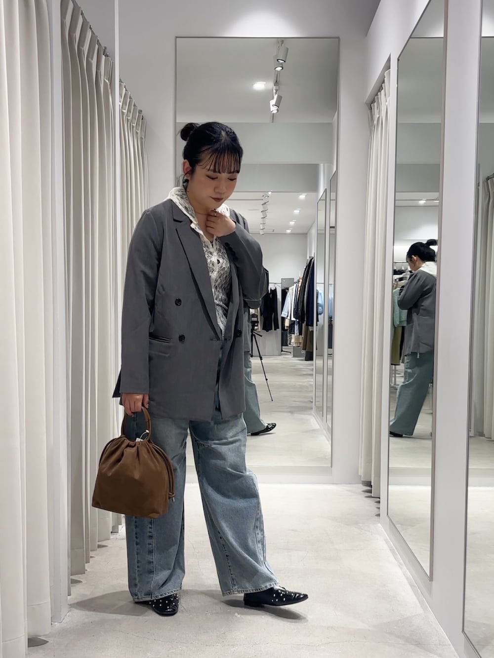人気のカーブデニムでゆるっとさを出して、スエード生地のバッグでオシャレな雰囲気に!