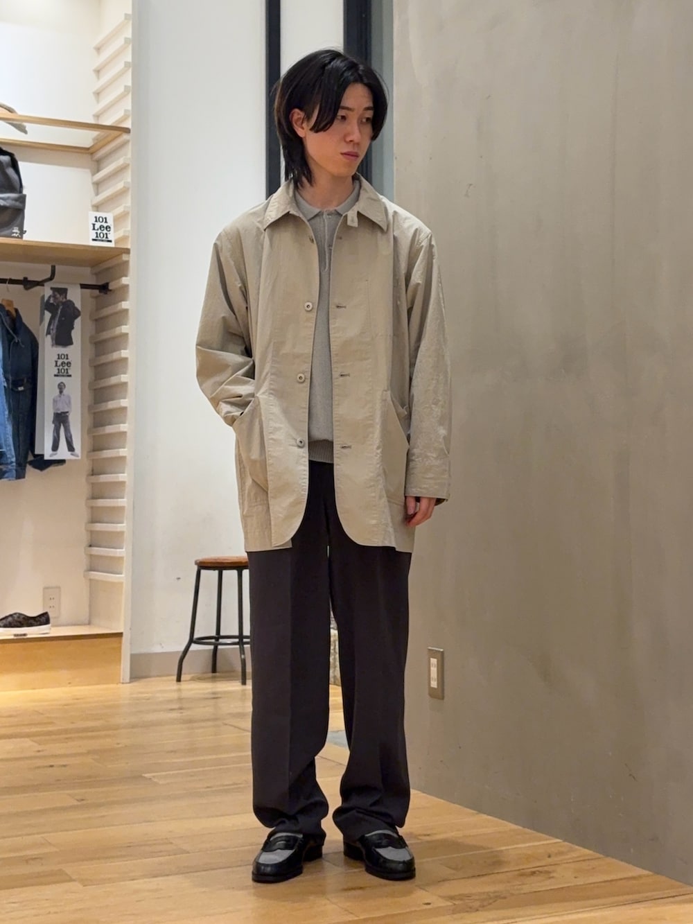 同系色のインナーを合わせてもシワ感の表情でのっぺりすることなく着用できます。