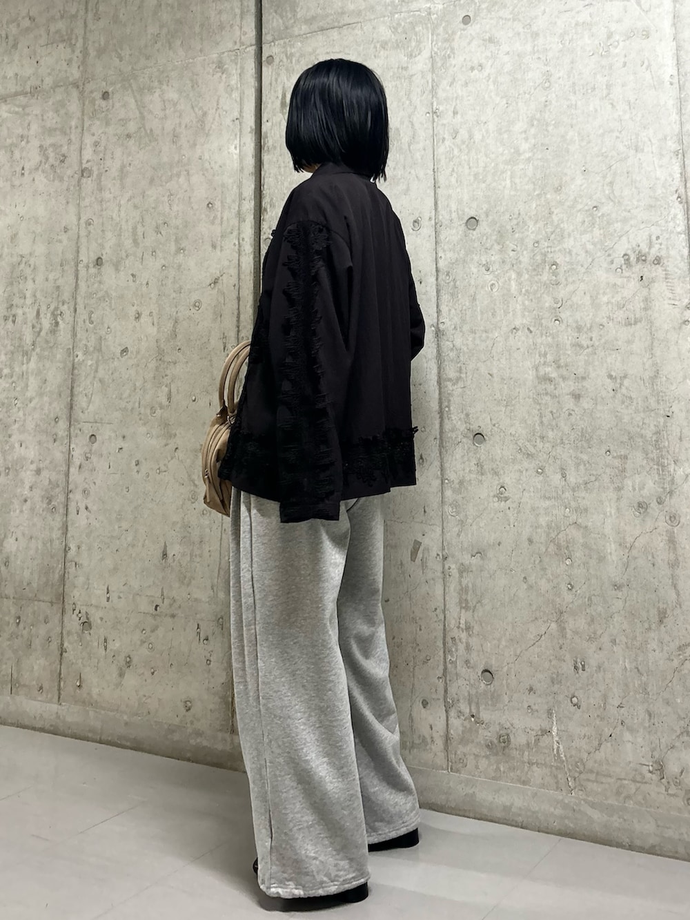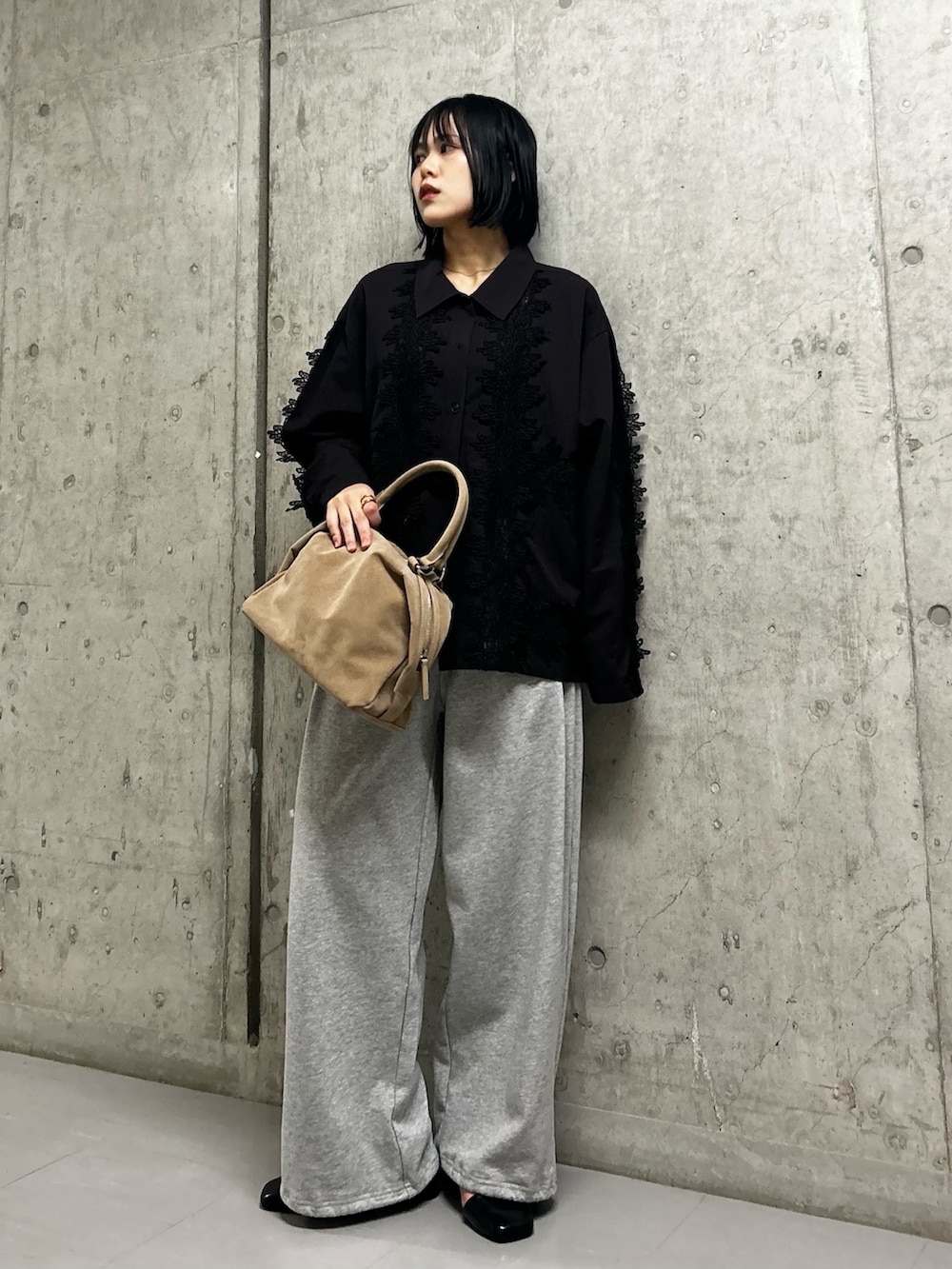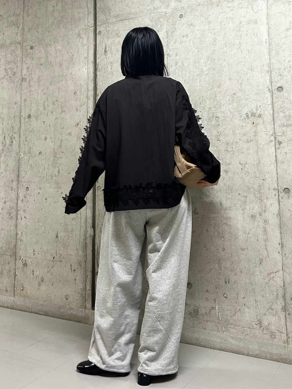 ドレッシーになりすぎないようにスウェットパンツでバランスをとってます!
