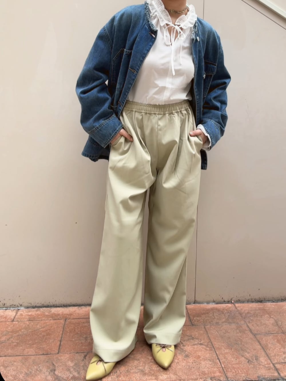 そこにノーカラーのデニムジャケットを羽織ることで、抜け感をプラスしつつ全体をバランスよく引き締めてくれる。