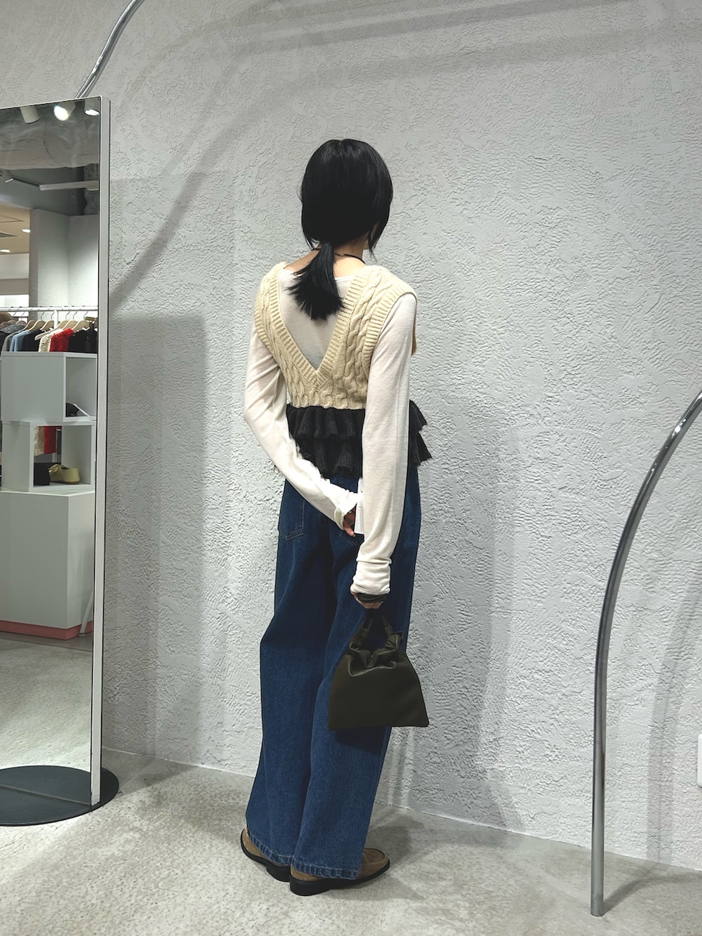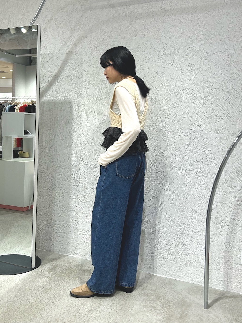 フリルニットベストにデニムを合わせてカジュアルに着てみました。