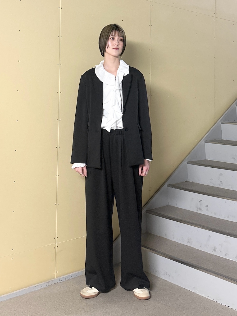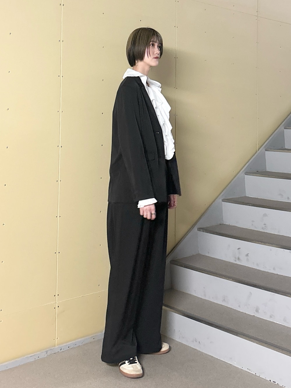 靴はあえて外しでスニーカーをチョイス。