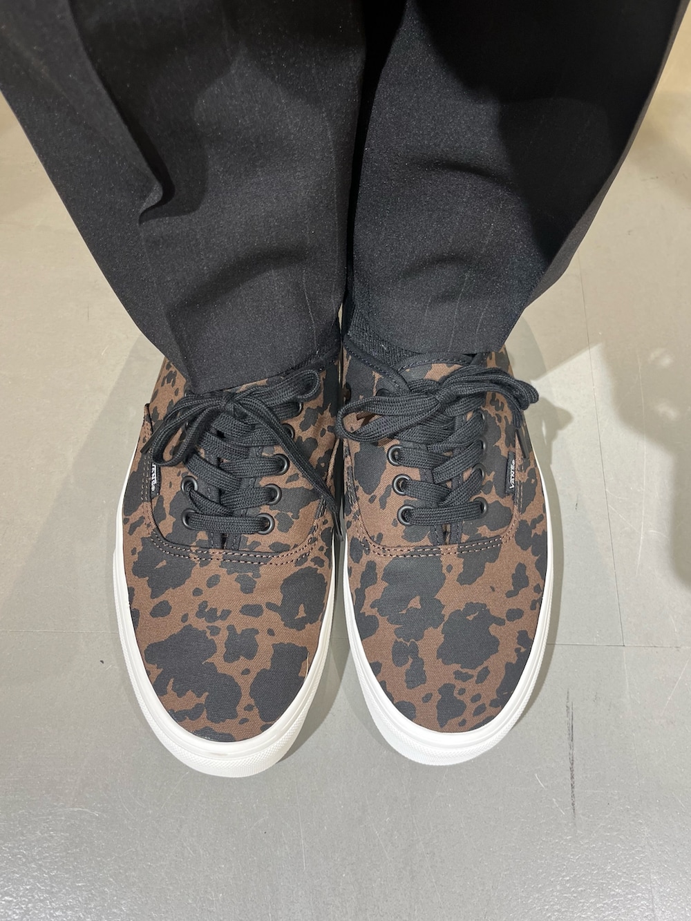 パンツは少しわかりにくいですが、ストライプのスラックスを合わせてvansの牛柄のスニーカーです!