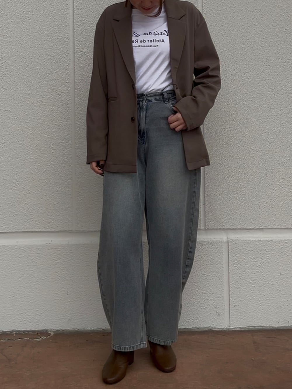 落ち着いたブラウンのテーラードジャケットに、白ロゴTとワイドデニムを合わせたきれいめカジュアルコーデ。