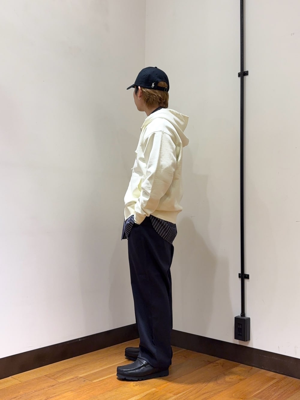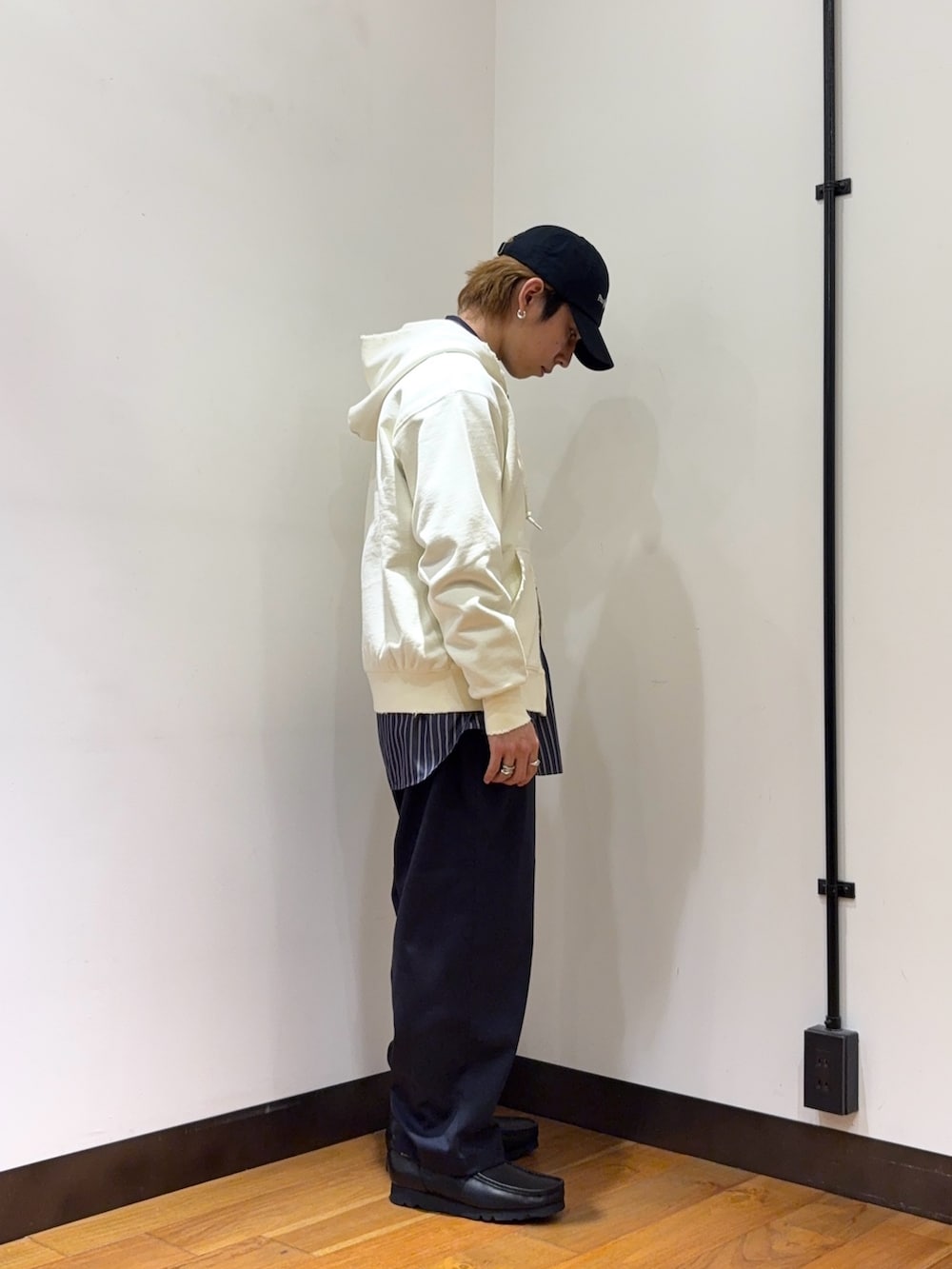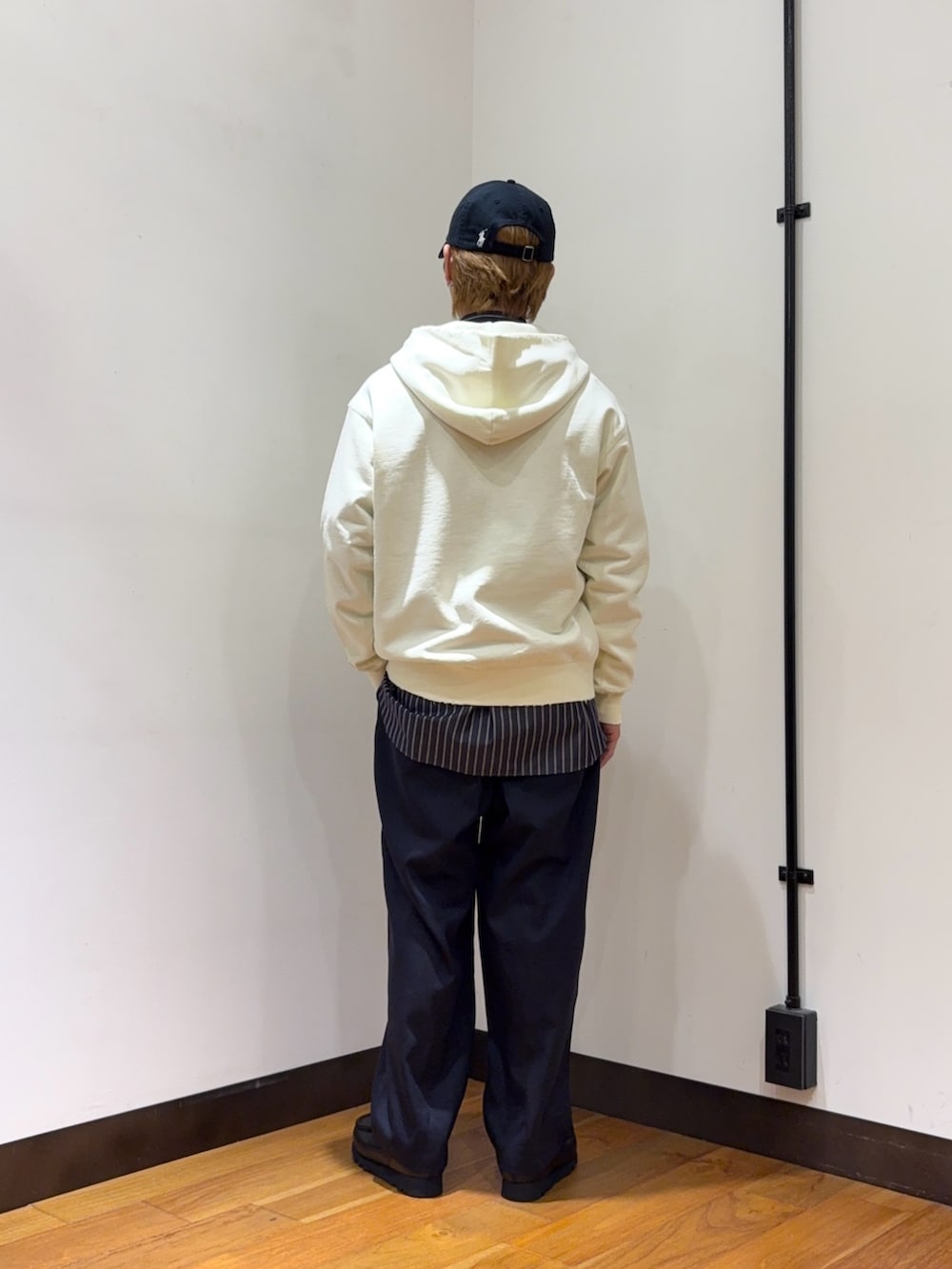 THOMAS MAISONのシャツやwide dadのパンツを使ってキレイにまとめたコーデにアクセントでダメージやフェードのかかったパーカーを合わせる、そうすることで程よい抜け感やカジュアルさを演出することができます。