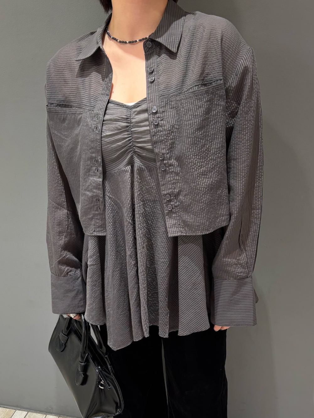 ショート丈のシャツと動きのあるビスチェがセットになったアイテムです!どちらも1枚で着ても可愛いデザインと使いやすさになっているのでワードローブにあると助かる1着に👍🏻