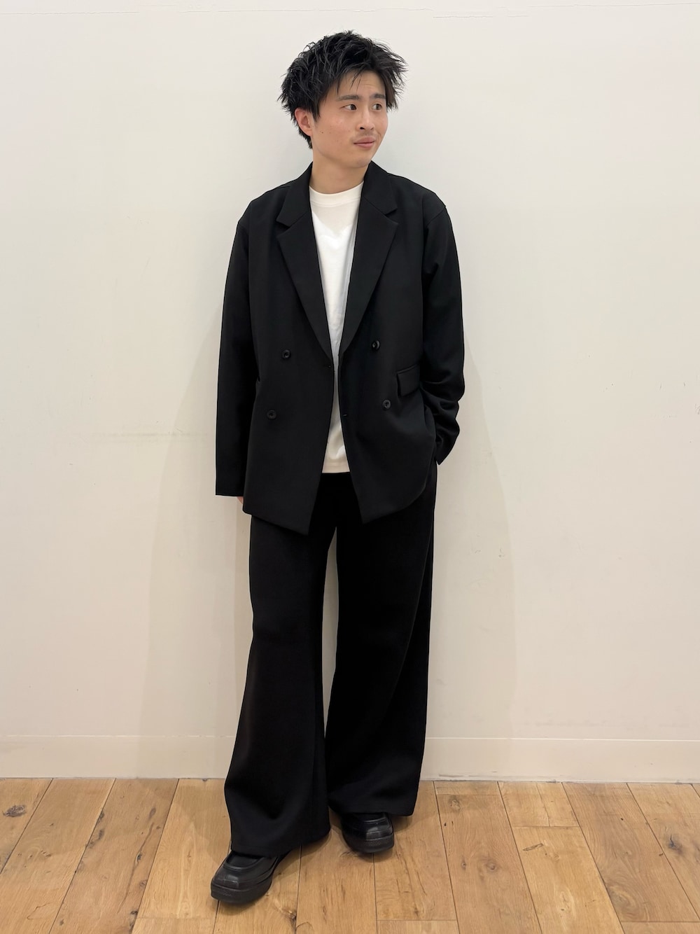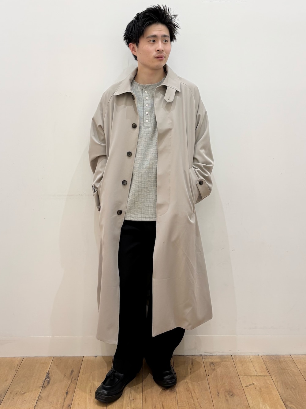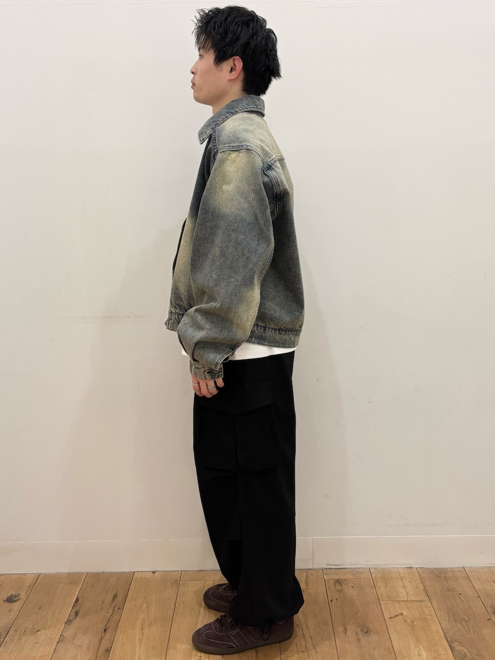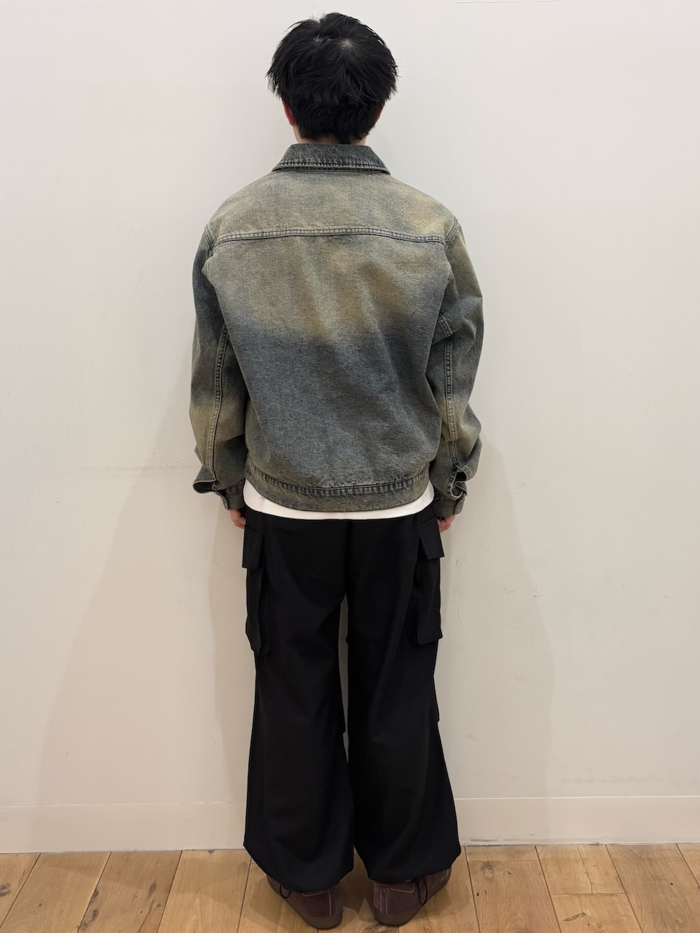 パンツには、カーゴパンツを合わせて、カジュアルなスタイリングに仕上げました。