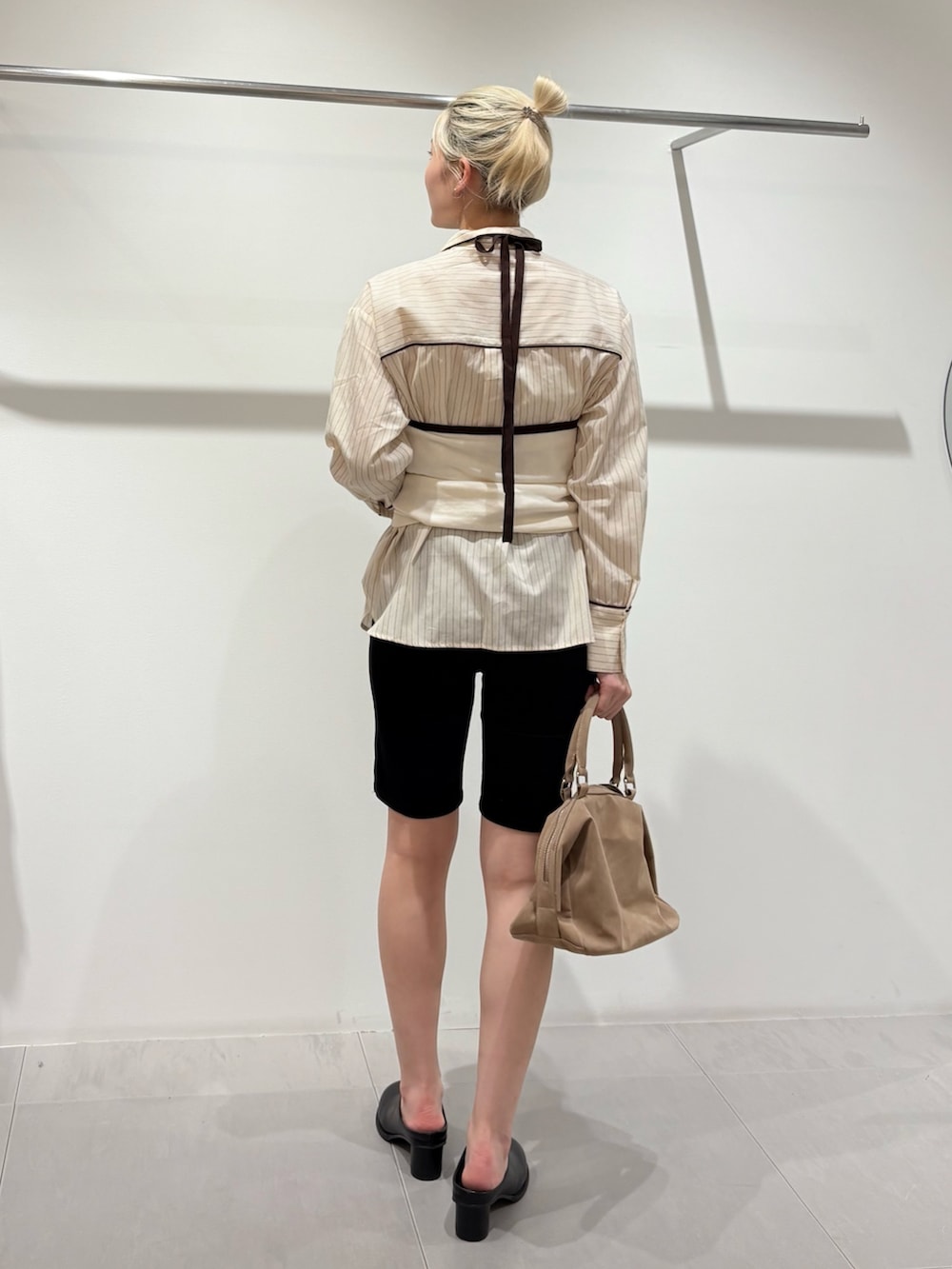 ストライプBIGシャツにバイカラービスチェSETトップスのビスチェを合わせたコーデ