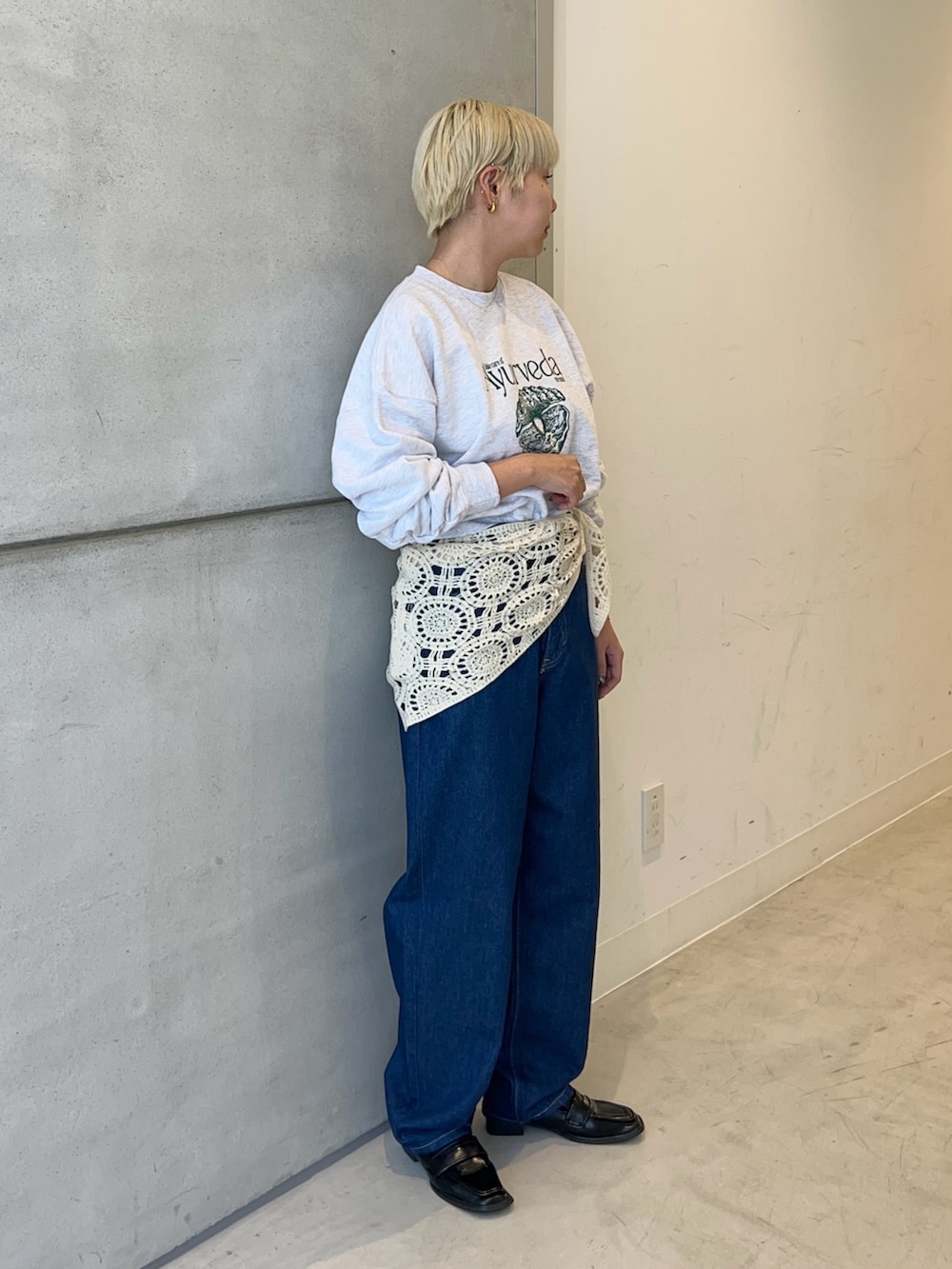 スウェット×デニムのシンプルなコーディネートにスカーフをアクセントにしてみました!