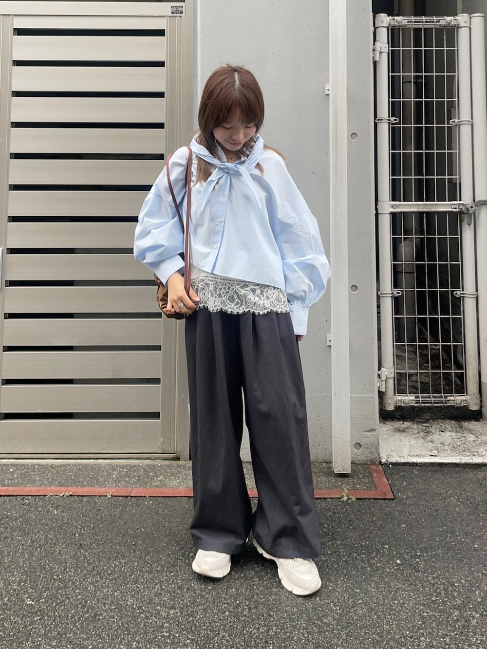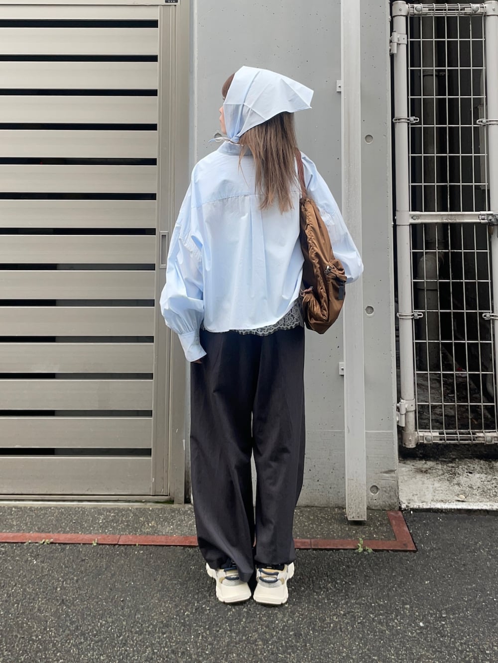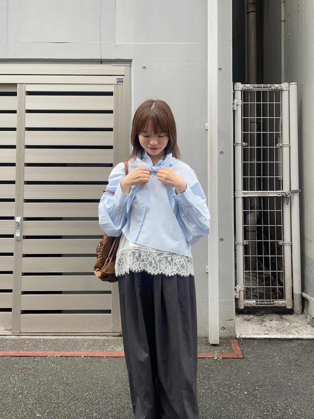 トップスのシャツはスカーフ付きのワイドショートシャツです!短い着丈なので中にレースキャミを合わせてレイヤードさせてみました!着丈もすっきりとしてるけど、お腹周り気になる方はワイドなシャツデザインなので、中に着こむことができますよ✨✨