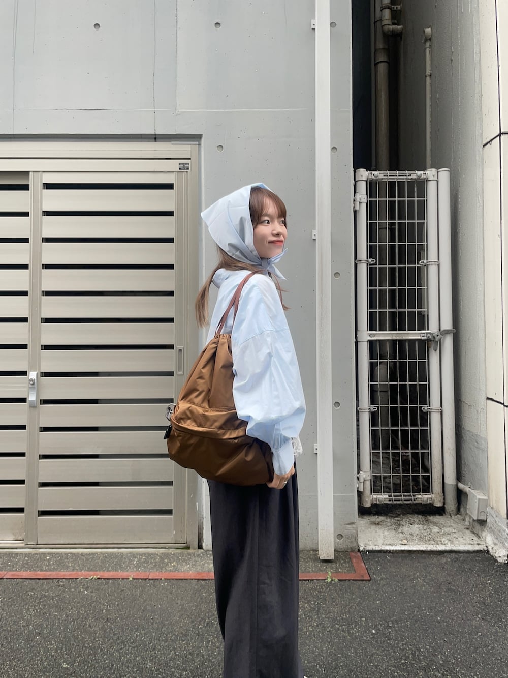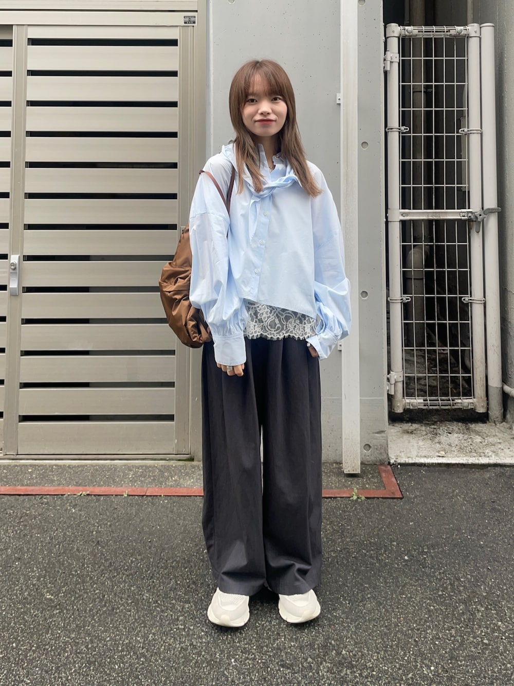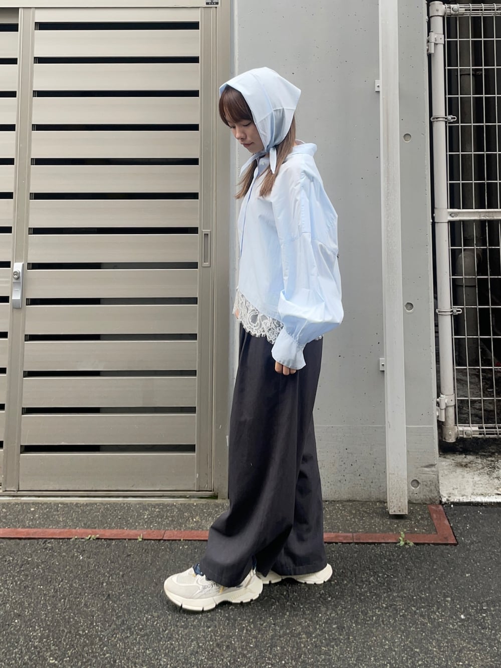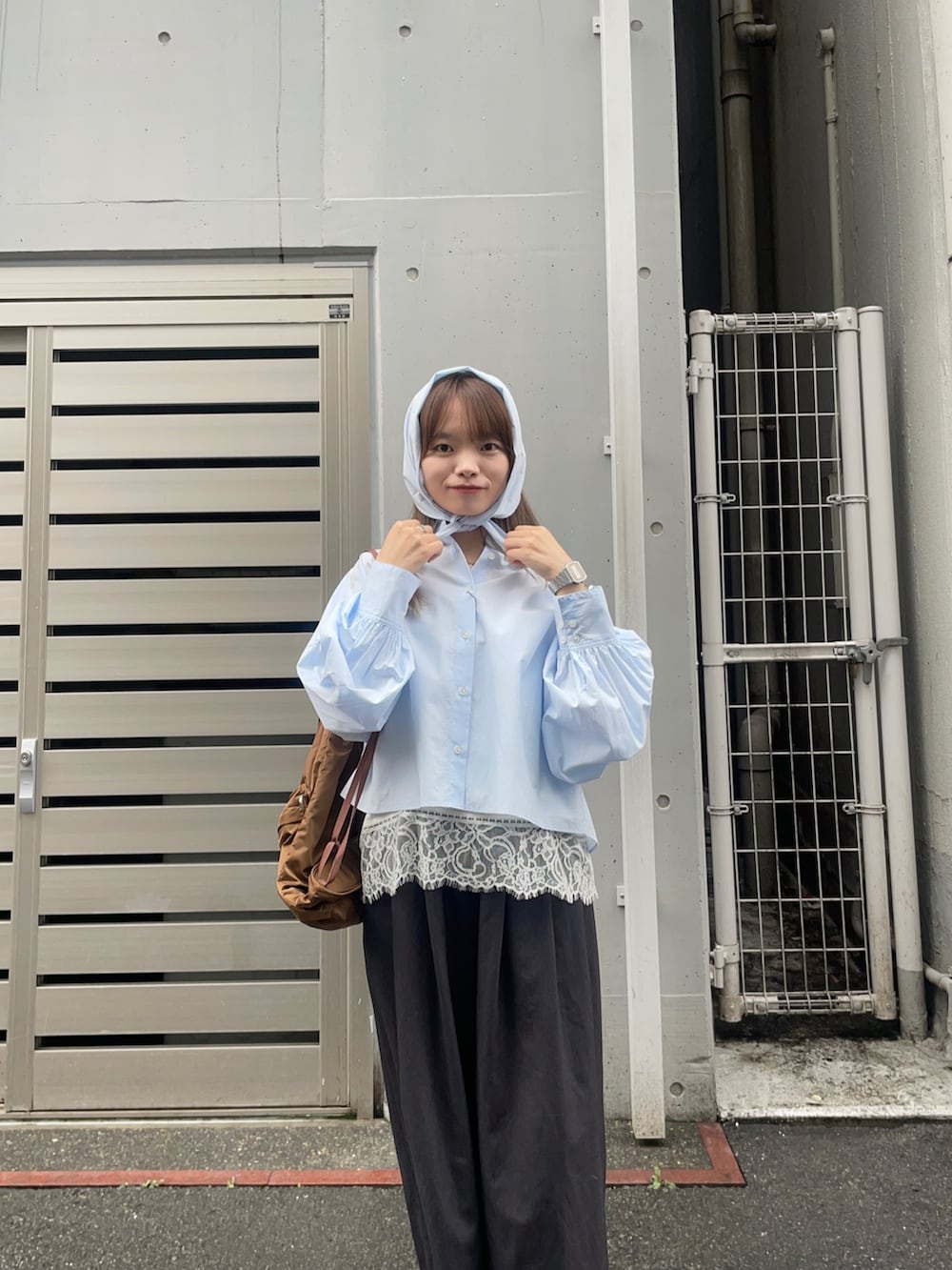 トップスのシャツはスカーフ付きのワイドショートシャツです!短い着丈なので中にレースキャミを合わせてレイヤードさせてみました!着丈もすっきりとしてるけど、お腹周り気になる方はワイドなシャツデザインなので、中に着こむことができますよ✨✨