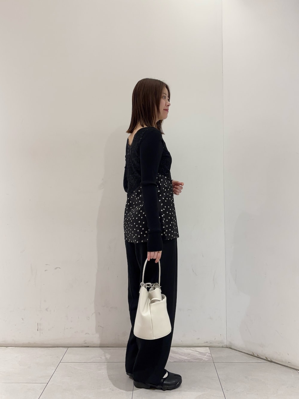 オールブラックなスタイリングに少し甘めのアイテムでトレンド感を◎