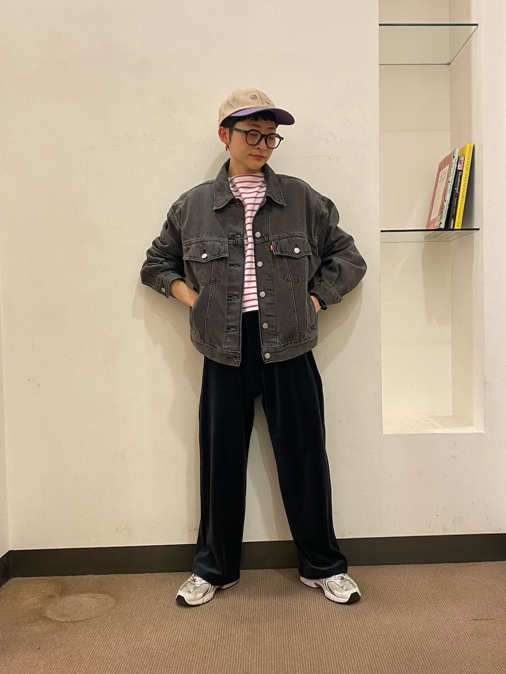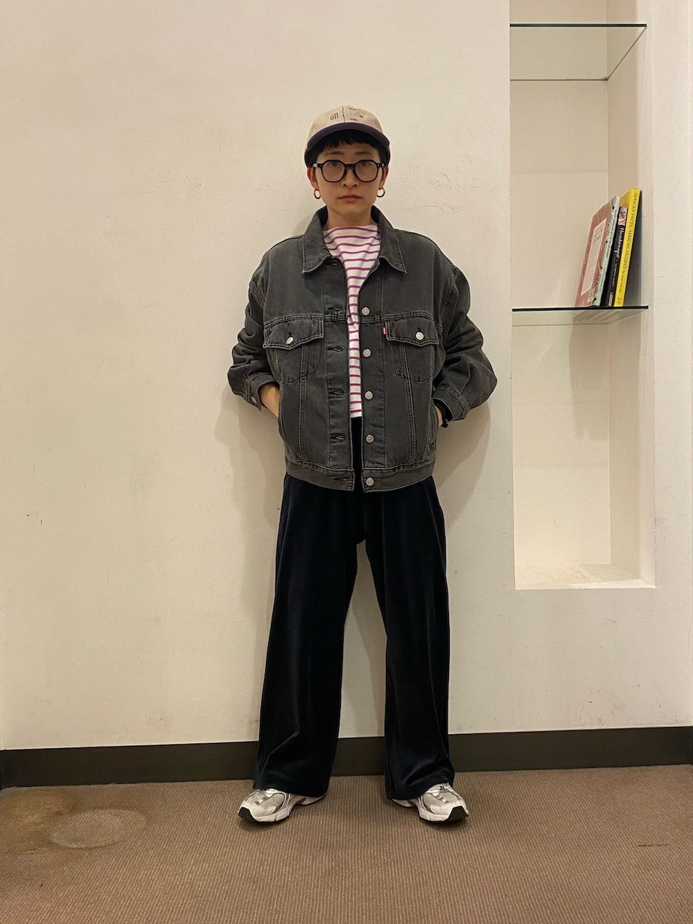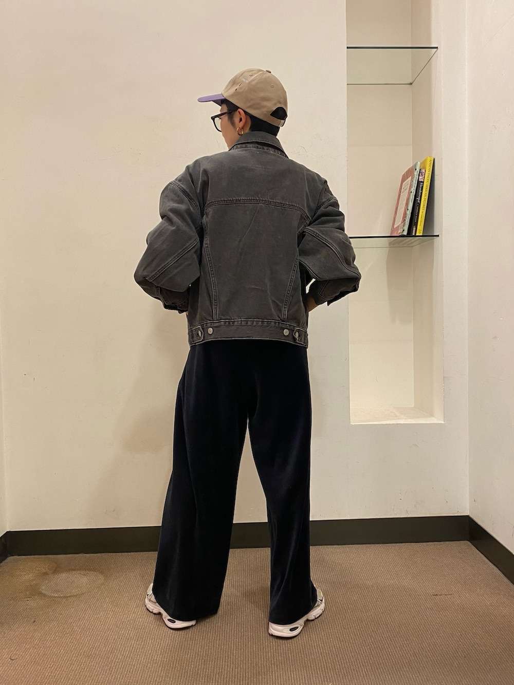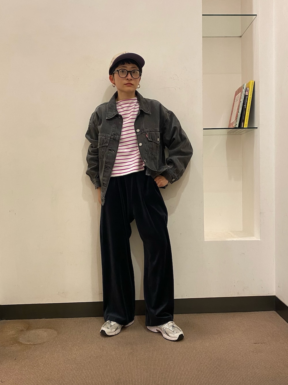 パンツはベロアにすることでデニムジャケット合わせのオーソドックスな合わせもどこか垢抜けますよ!