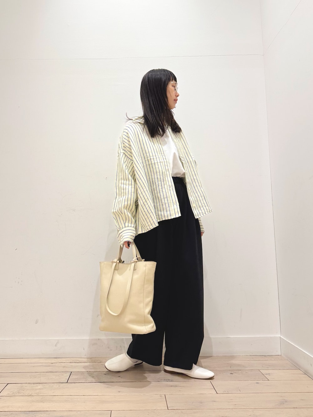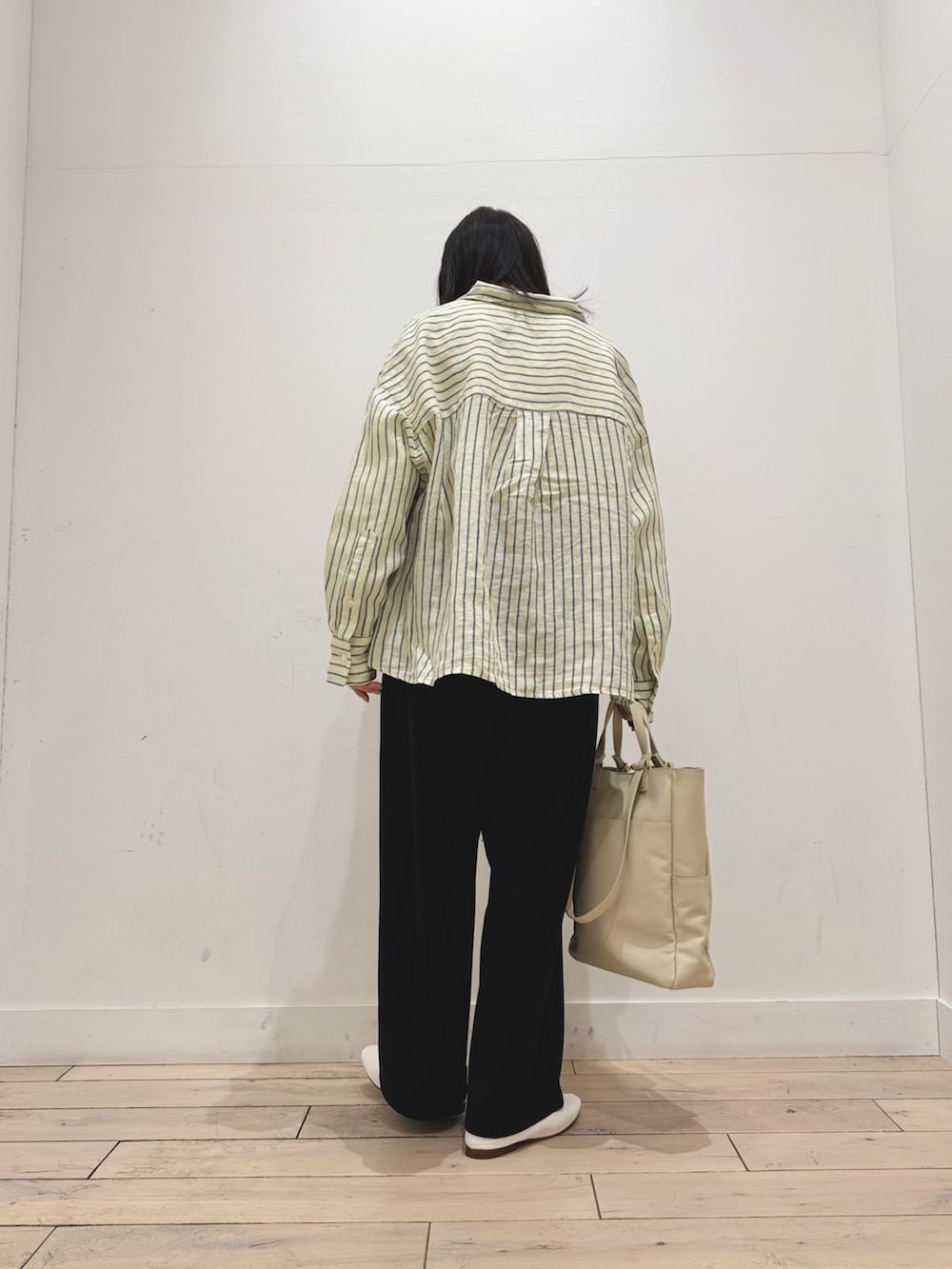 リネンシャツ開けて羽織で着用しました♪後ろがほんのり長いのでシルエットがかわいいです◎