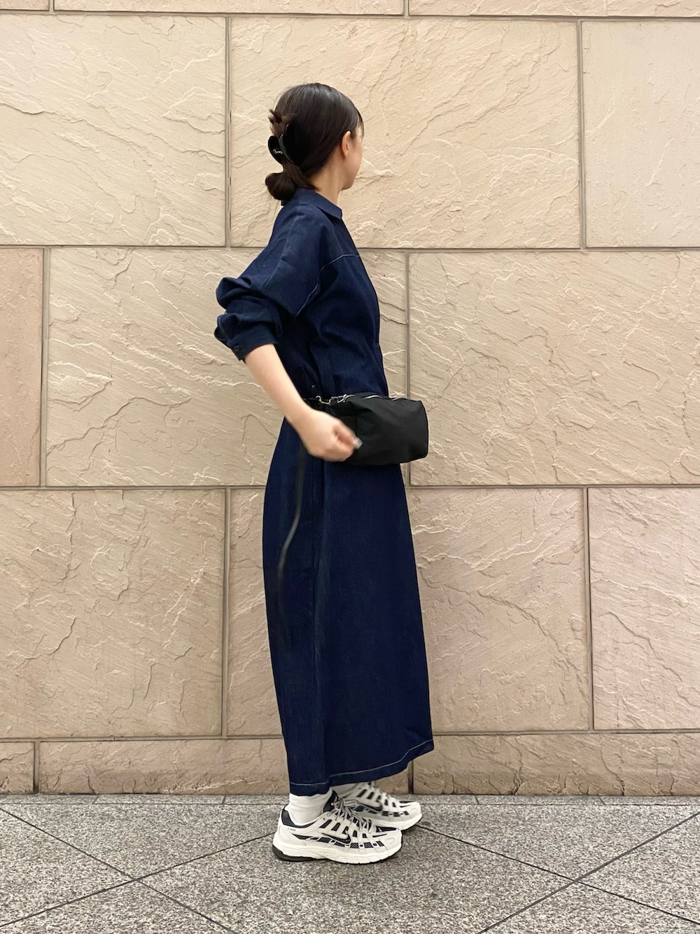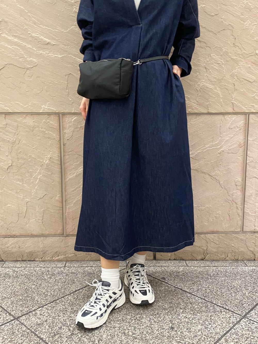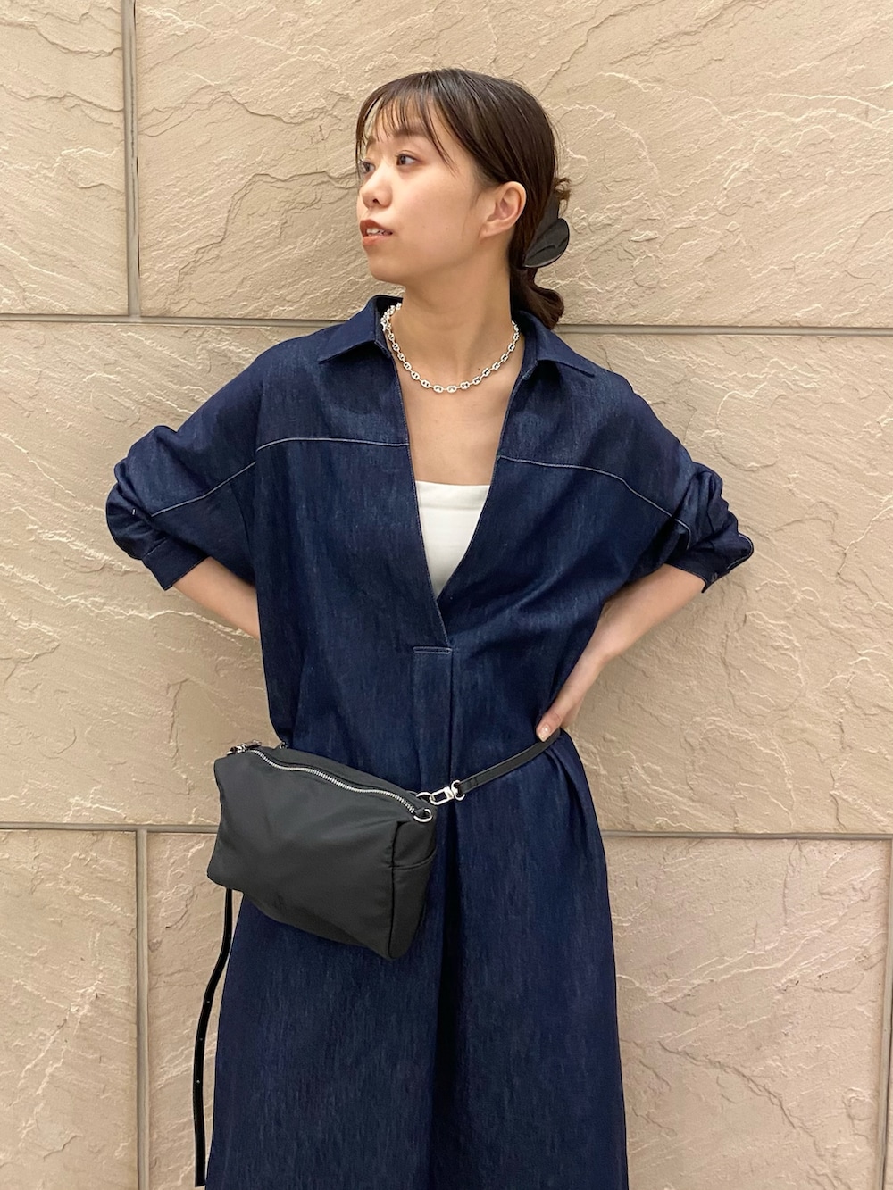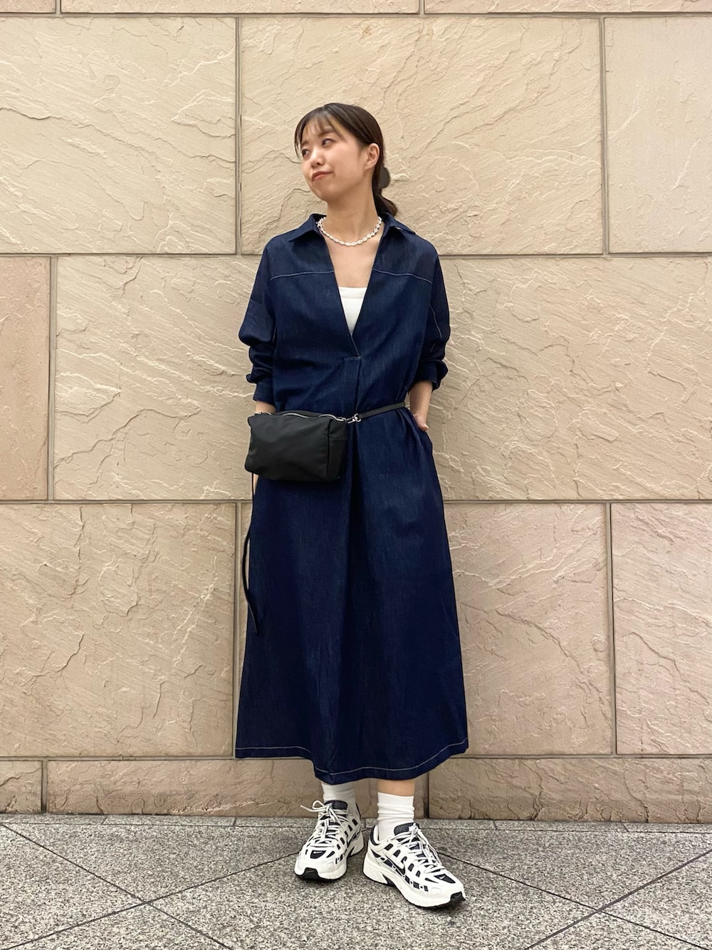 ハイウエストに見えるようベルトの代わりにウエストポーチをオン!