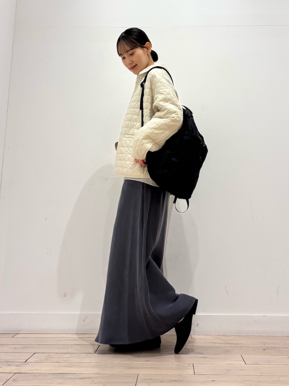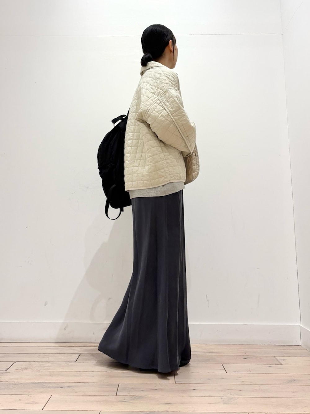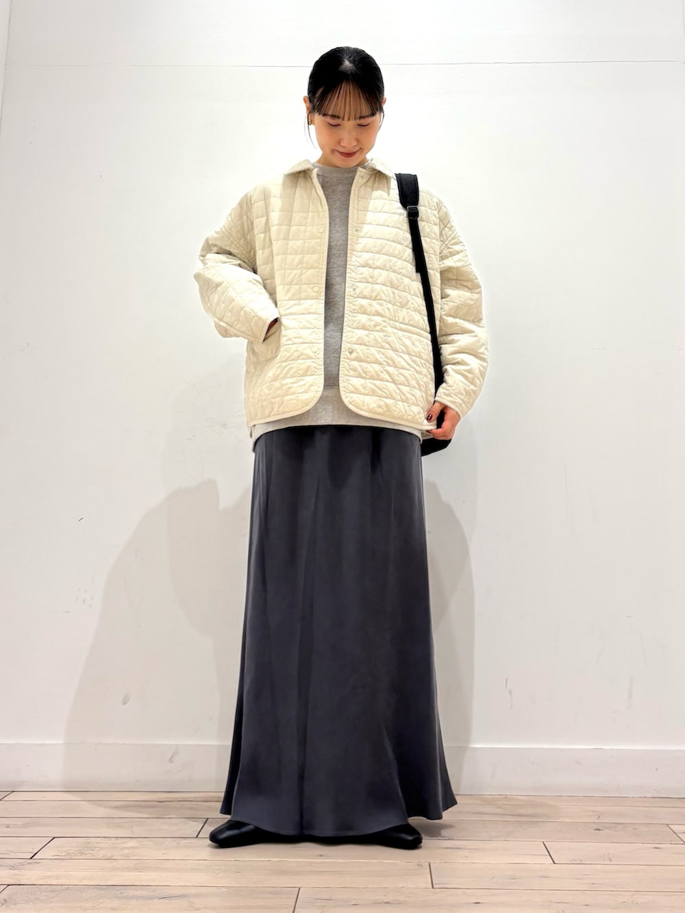 合わせたスカートはてろっとした素材感で広がらず、スッキリとした印象に👏