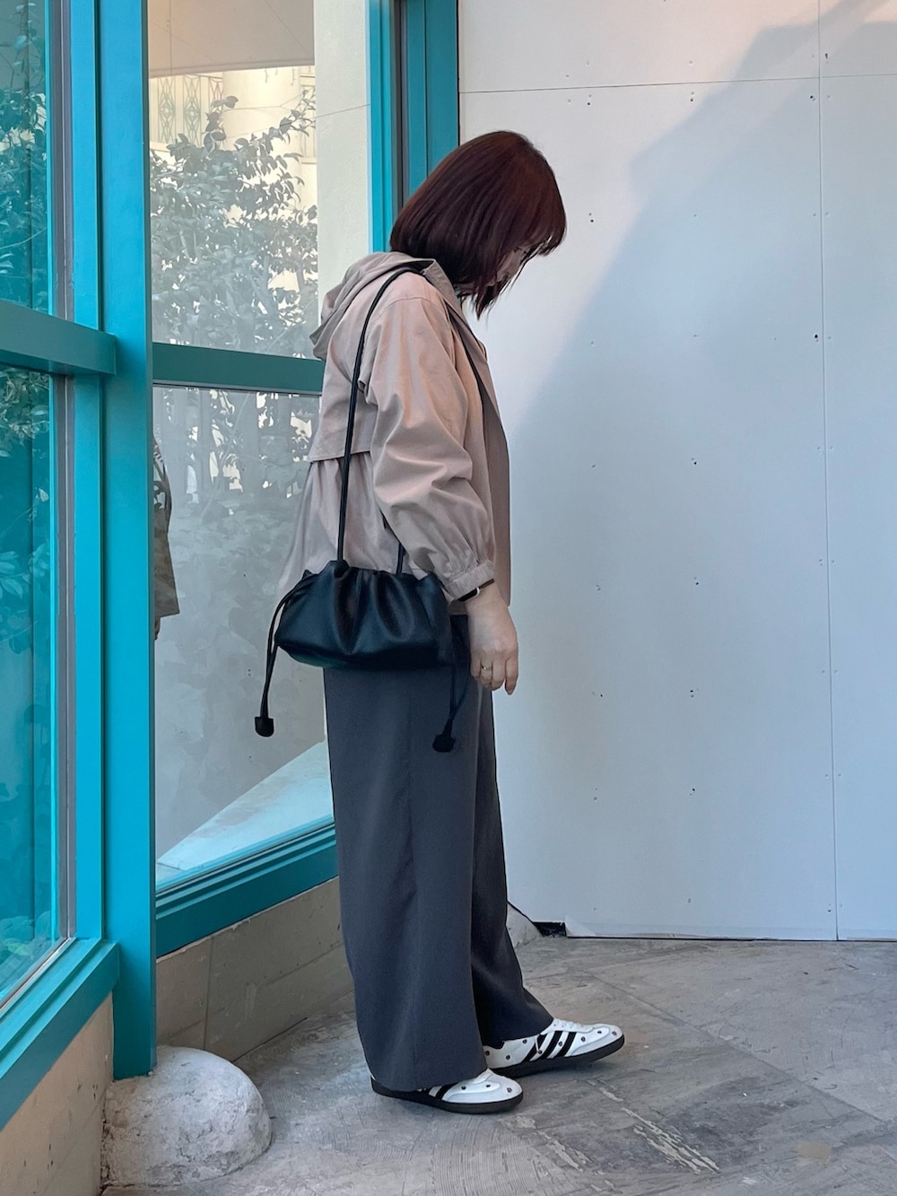 ピンクベージュのやわらかなカラーが顔まわりを優しく見せてくれるので、50代にも取り入れやすい春アウターです。