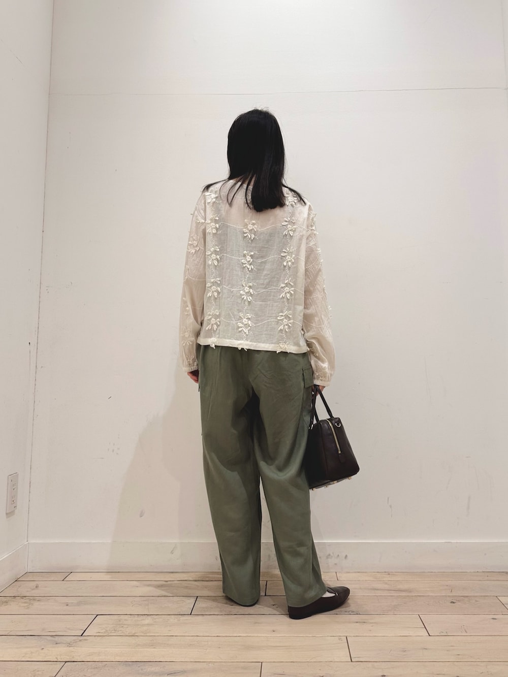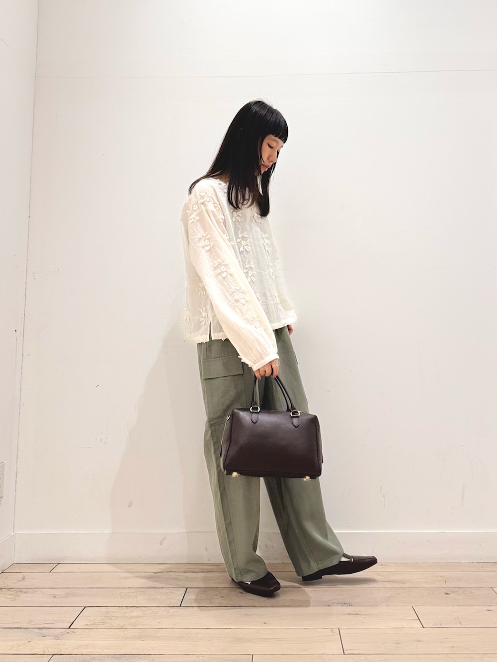 白ブラウス×カーキボトム、春の定番コーデです☘️