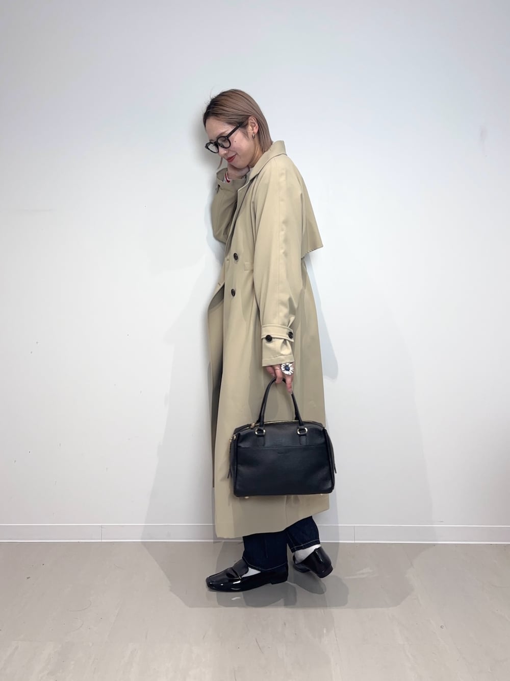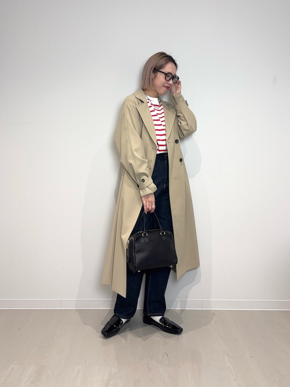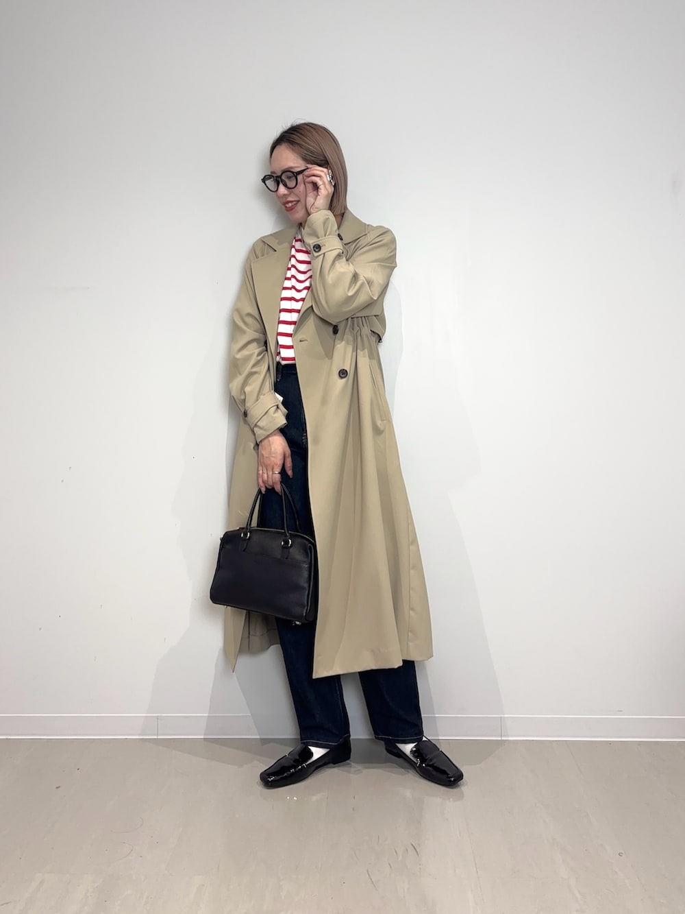 インナーは赤ボーダーでトレンチ×デニムに王道で真似しやすいコーデです♪