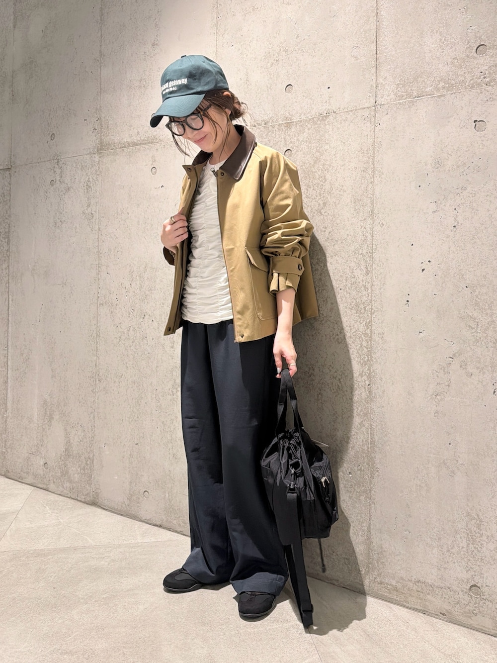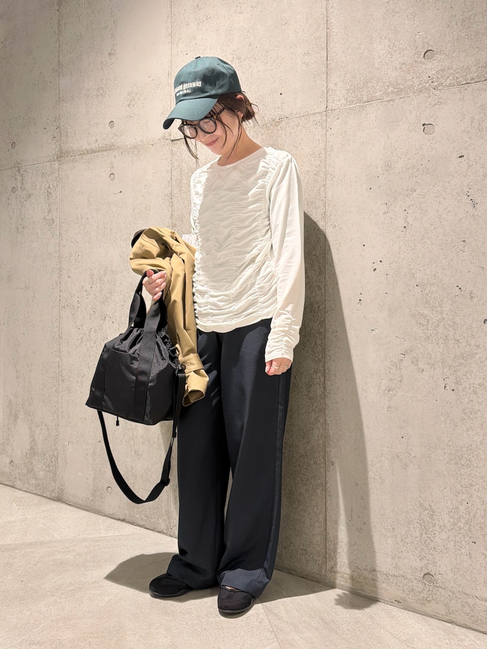 今回は、ギャザーがたっぷりと入ったカットソーをインナーで合わせた、大人カジュアルコーディネートです。