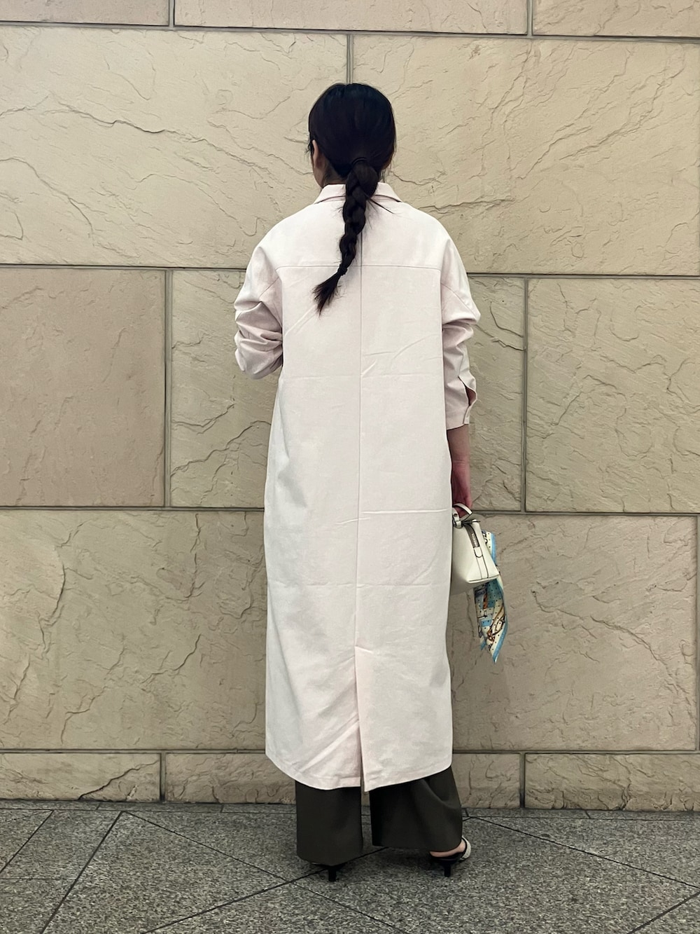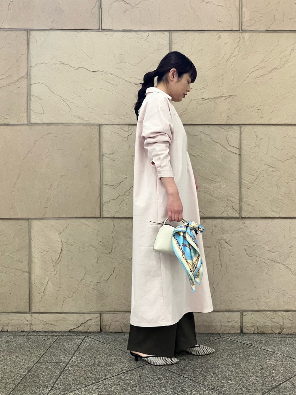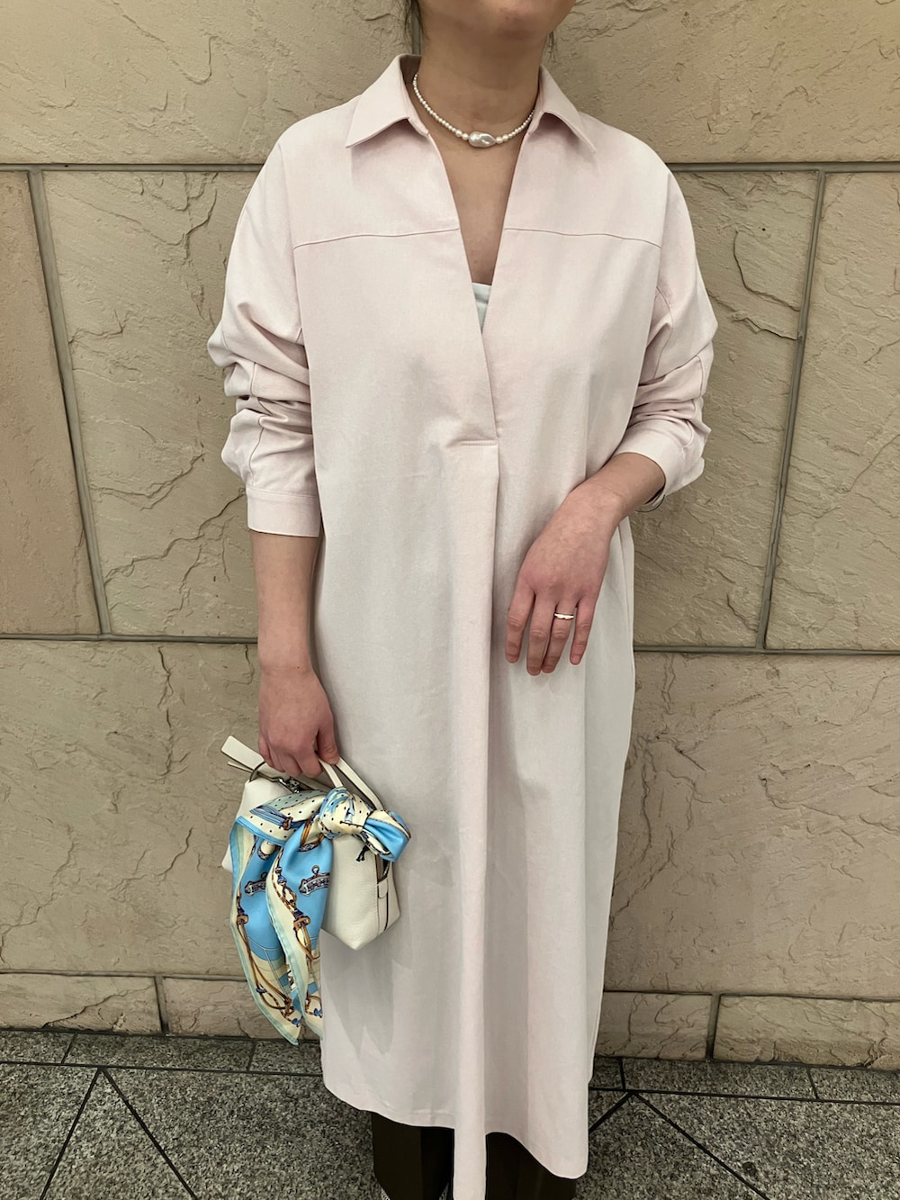 淡めのピンクカラーが素敵なシャツワンピース。