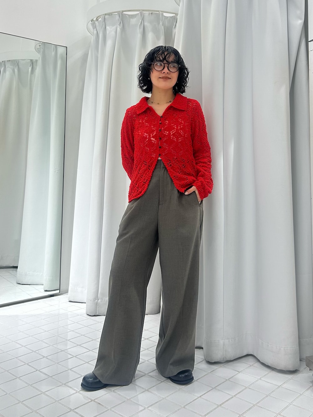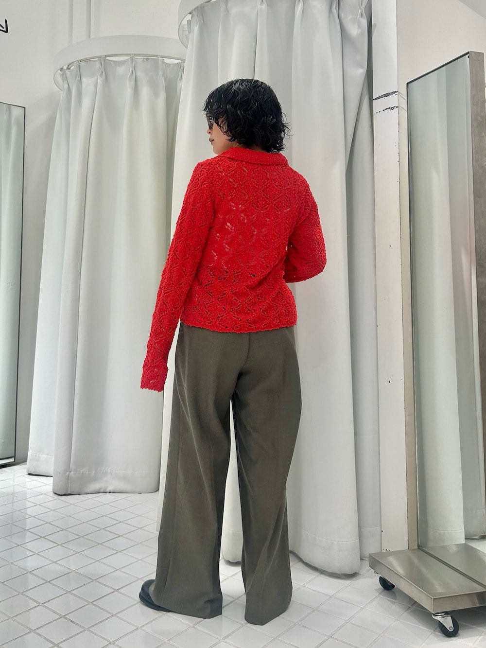 着心地抜群なニットは、パキッとした赤で着映え間違いなしです〜