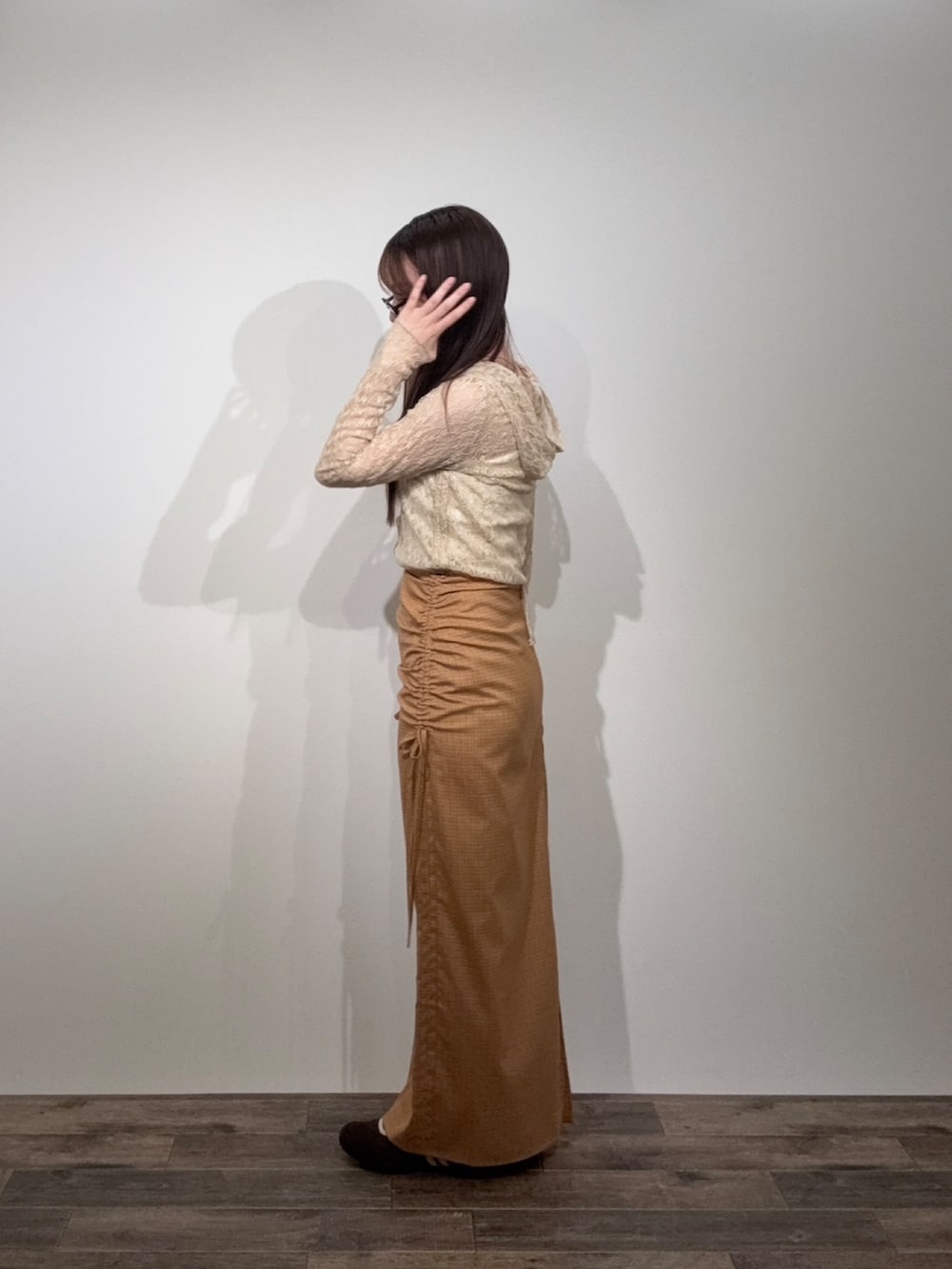 スカートのオレンジも落ち着いた色で普段使いしやすいです🍊🤍