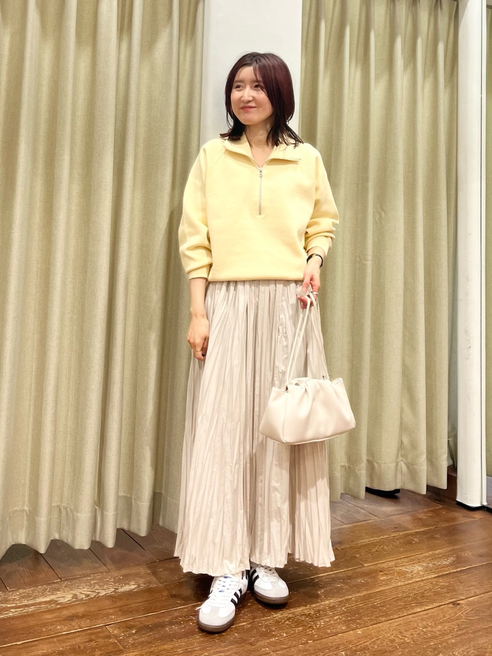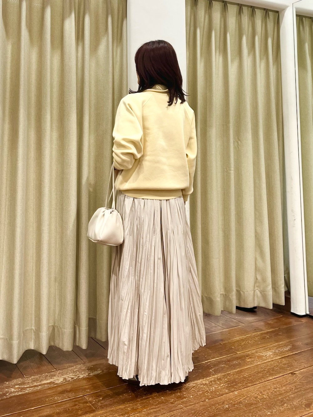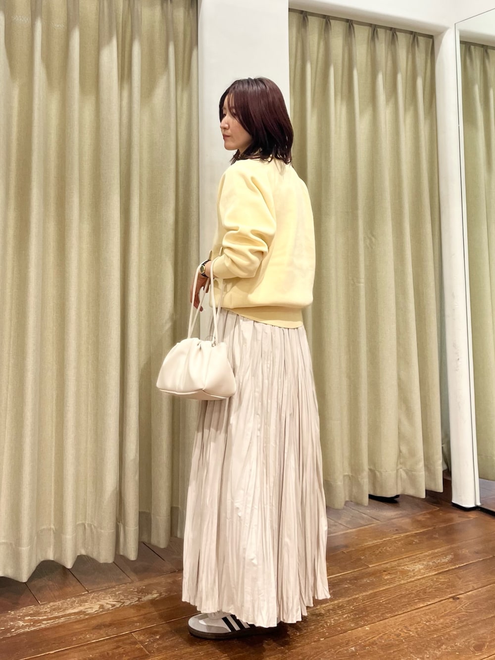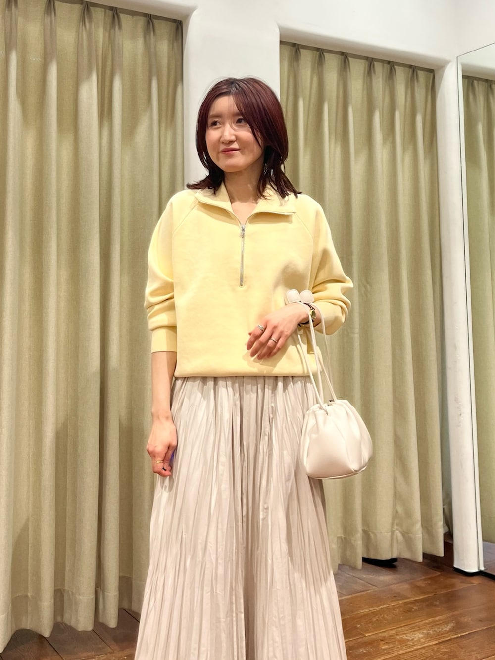 合わせたスカートはプリーツがランダムになっているので甘すぎず大人っぽく着ていただけます。