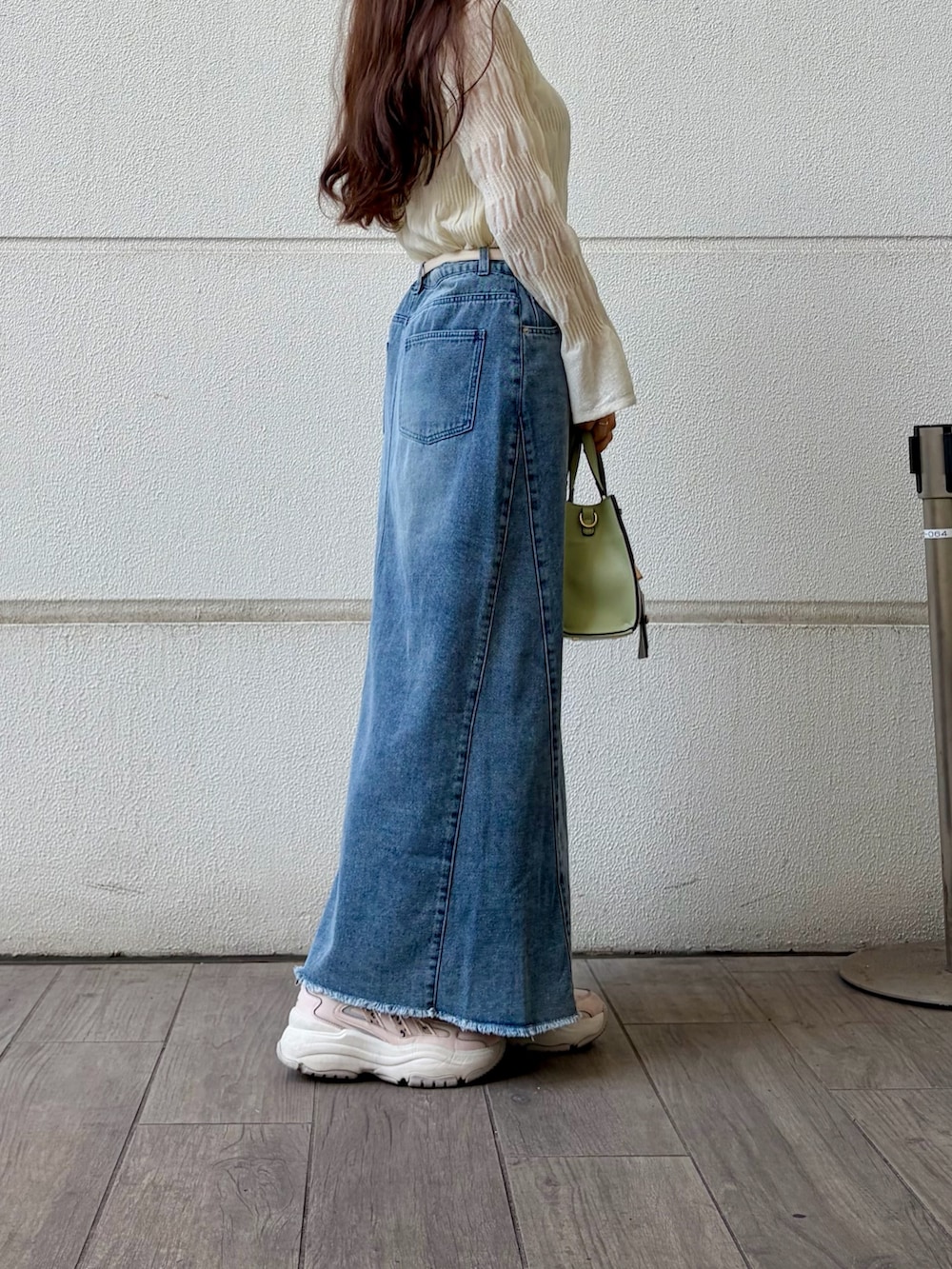 柔らかい透け感のある白ニット×ブルーのロングデニムスカートで抜け感のある大人カジュアルコーデです🤍