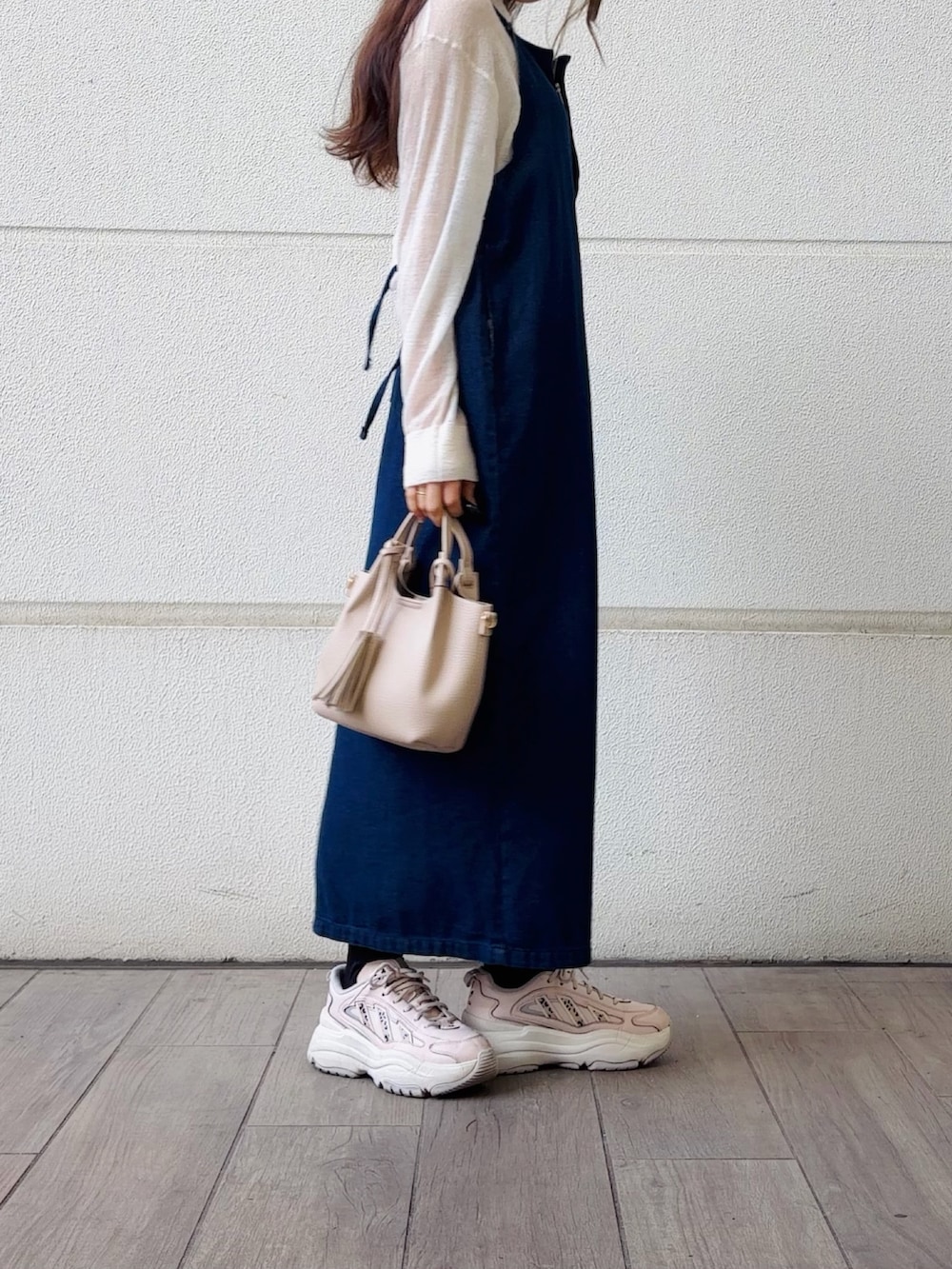 白のシースルー長袖トップスにネイビーのデニムジャンスカを重ねた、きれいめカジュアルコーデです🐇