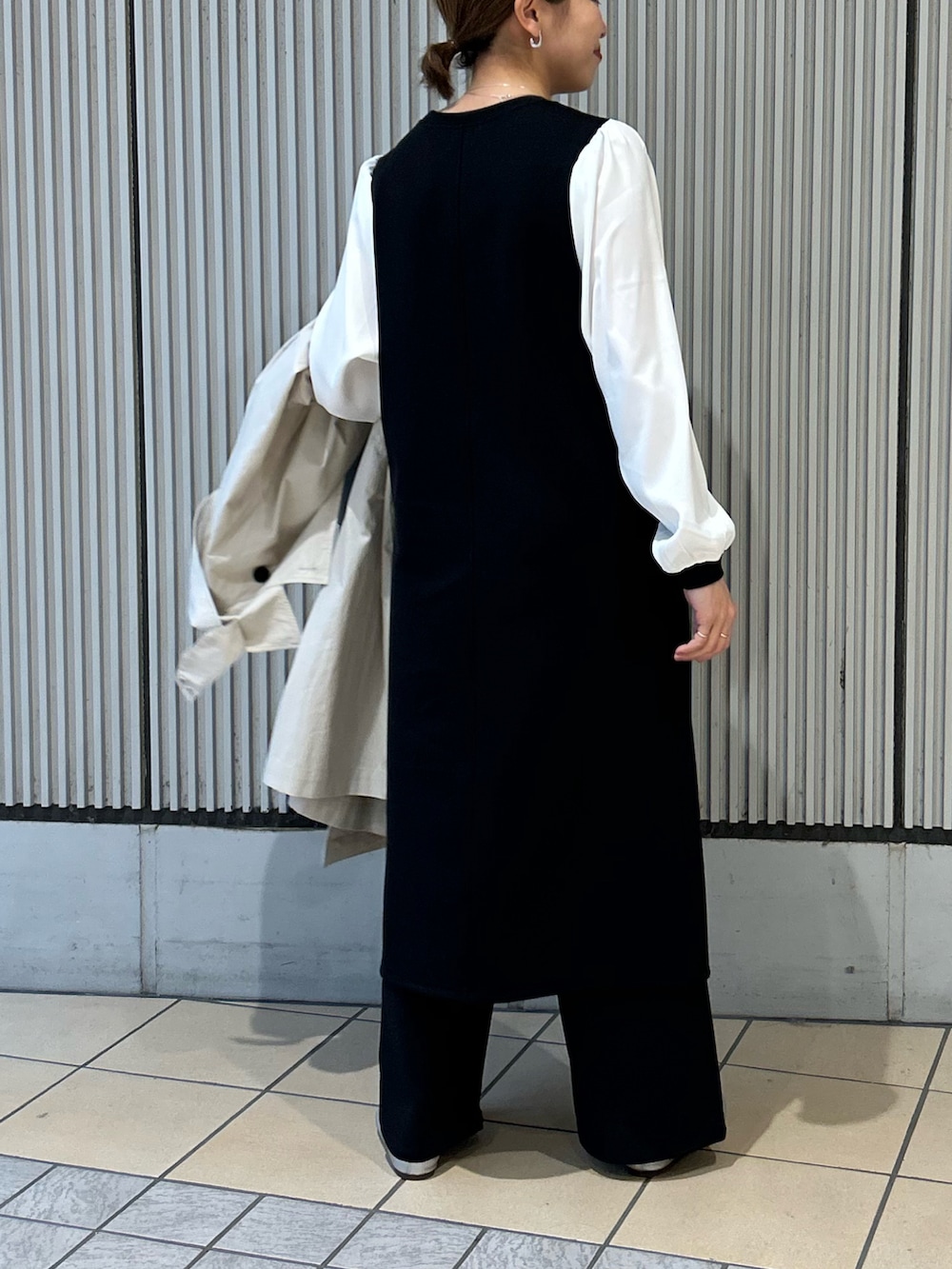 私の身長だとワンピースの着丈がやや短いので、パンツをレイヤードしてモードな雰囲気にまとめました🙆♀️