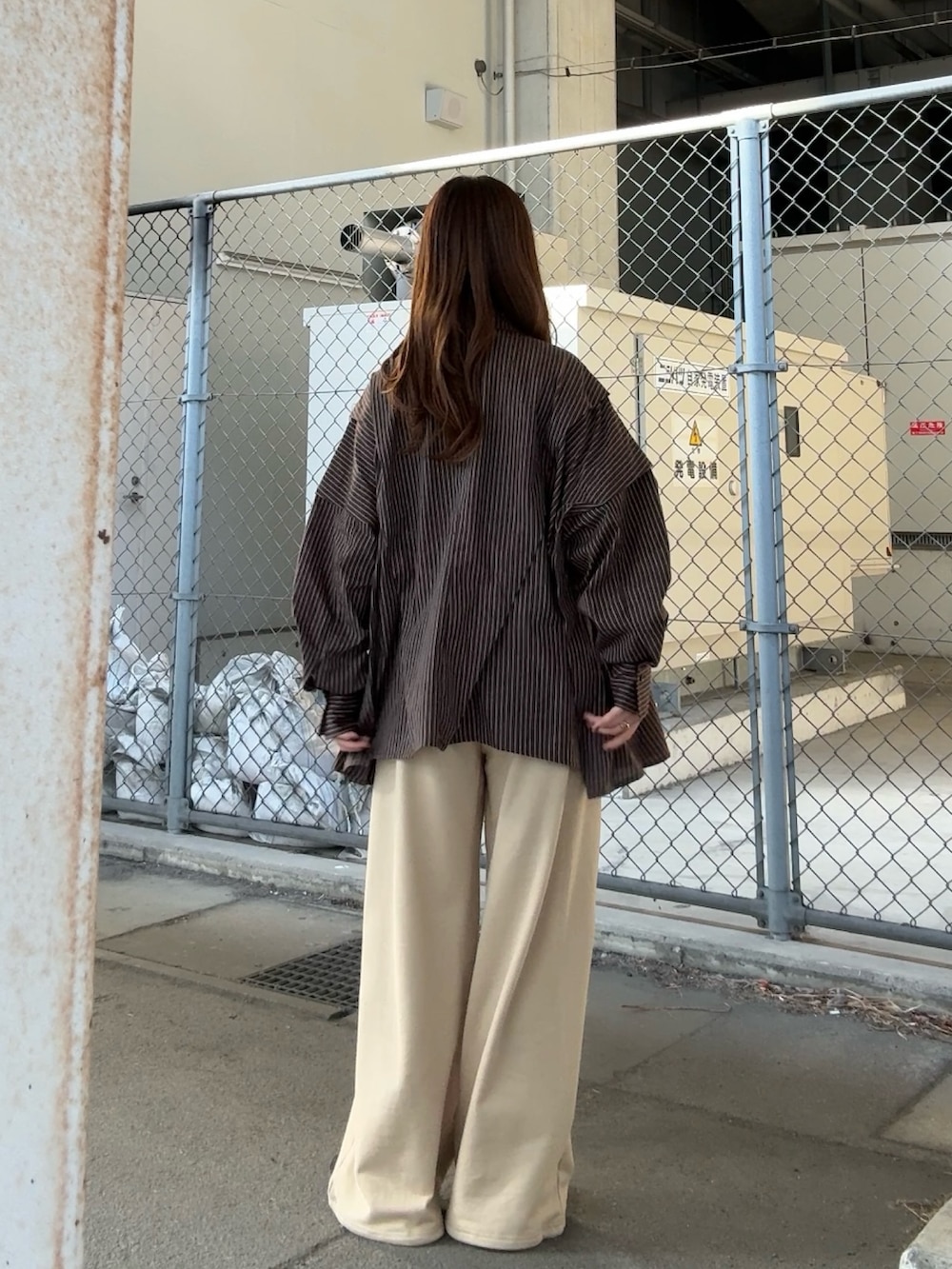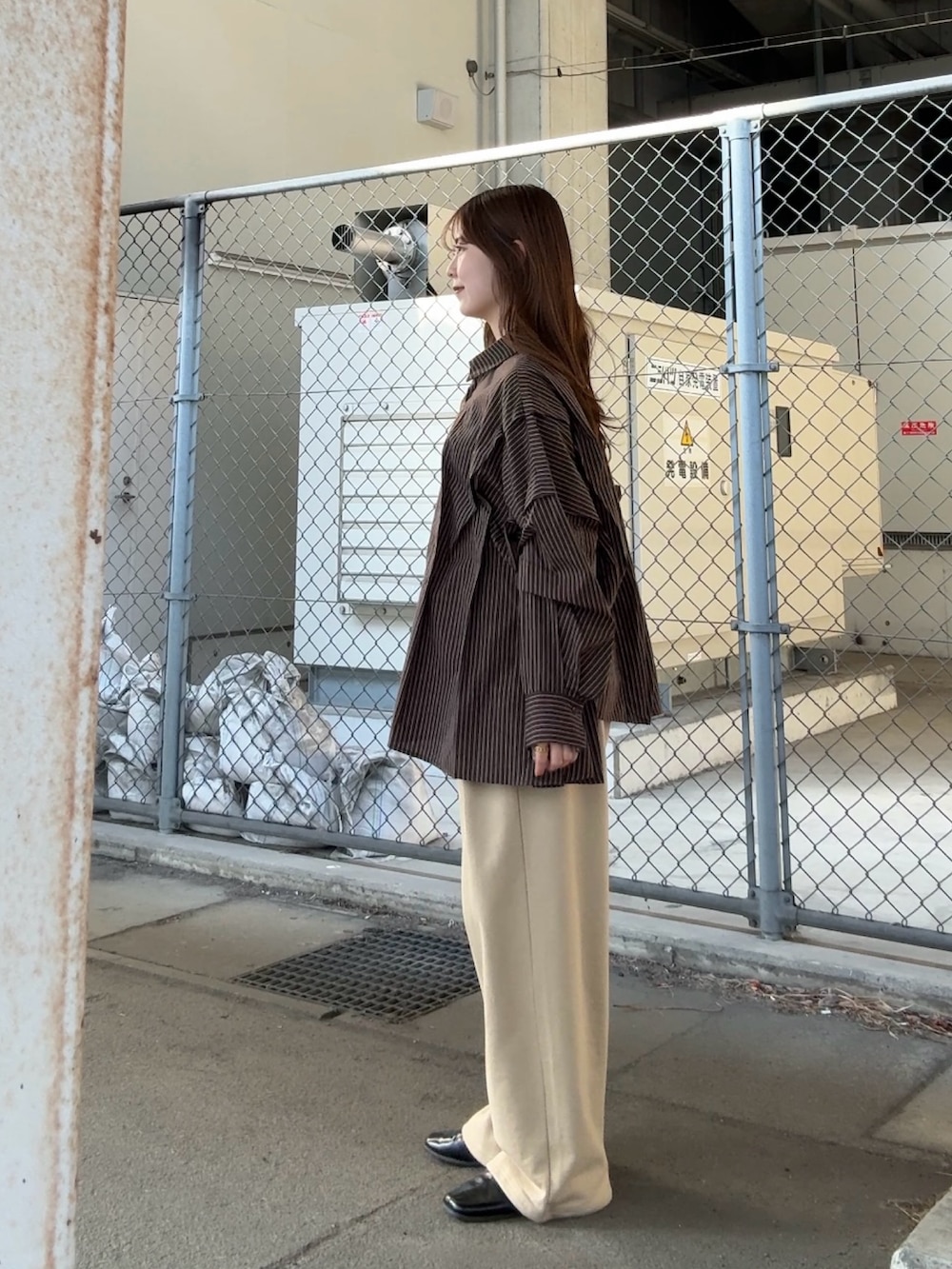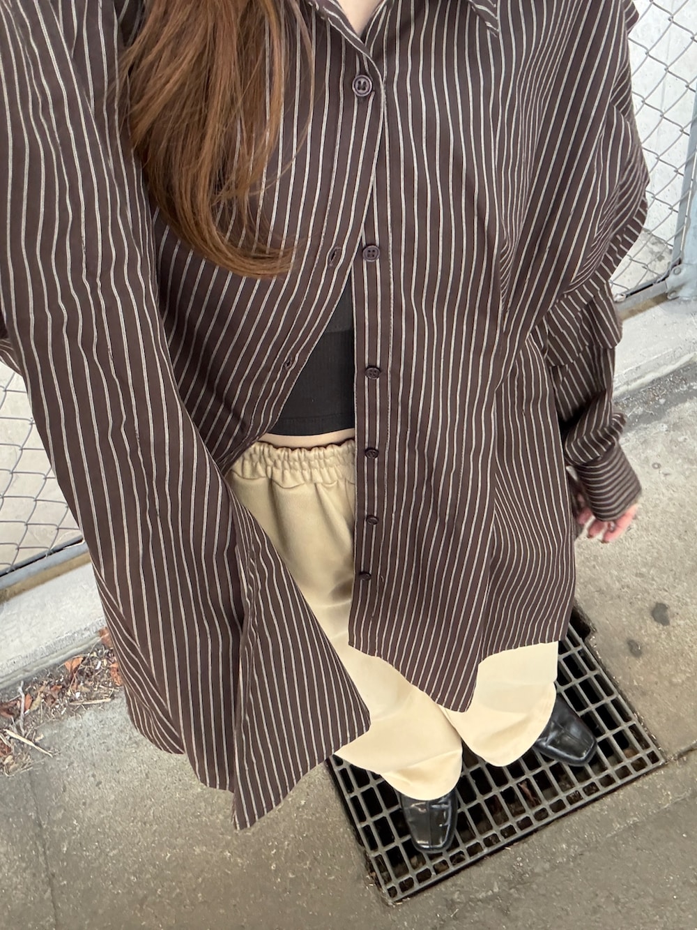 ブラウンカラーのストライプシャツは大人っぽく、
