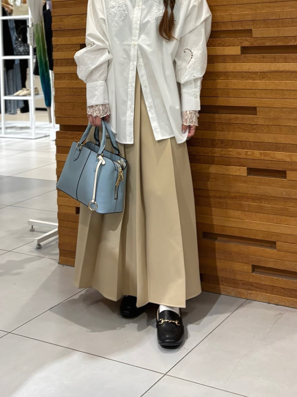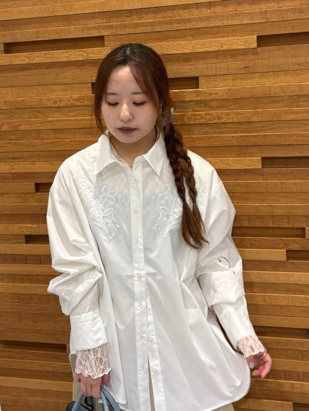 シャツのお花の刺繍も春っぽくて可愛いです♡